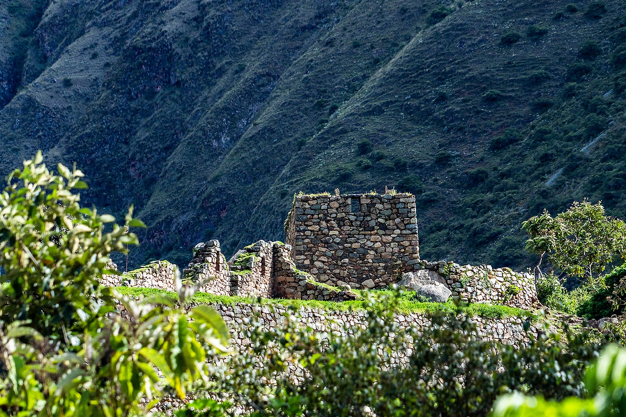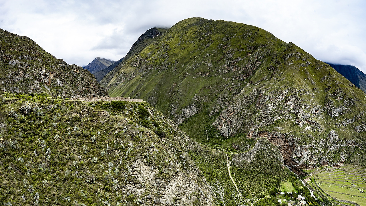 능선 위에 위치한 윌카라카이(Huillca Raccay) 유적. 아래에 신성성을 부여받은 빌카노타 계곡이 있다. 오른쪽 아래 제사터로 보이는 산봉이 있고 그 밑은 파타약타 유적이다