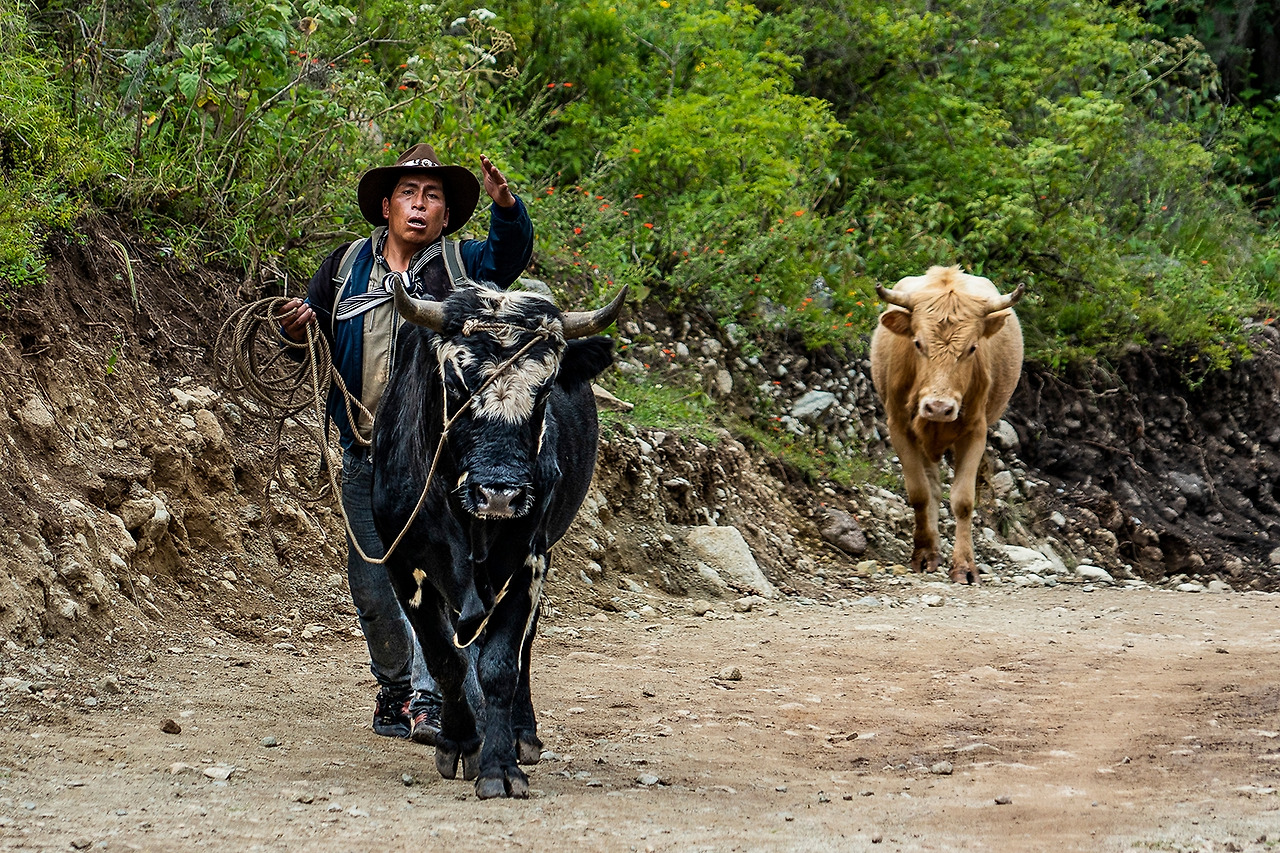 등산객들에게 비키라고 소리치는 소몰이 농군