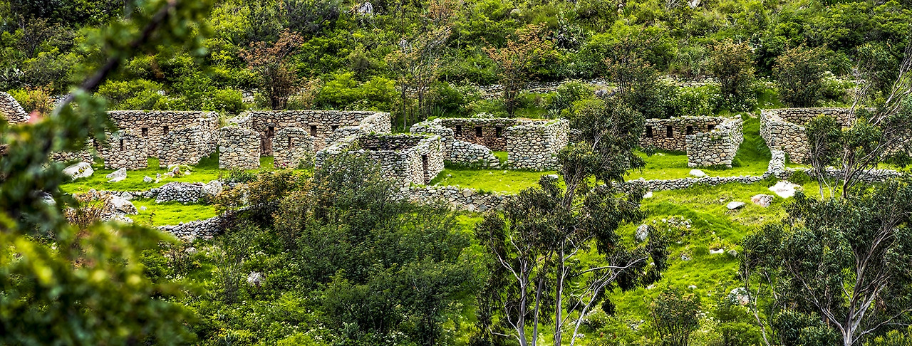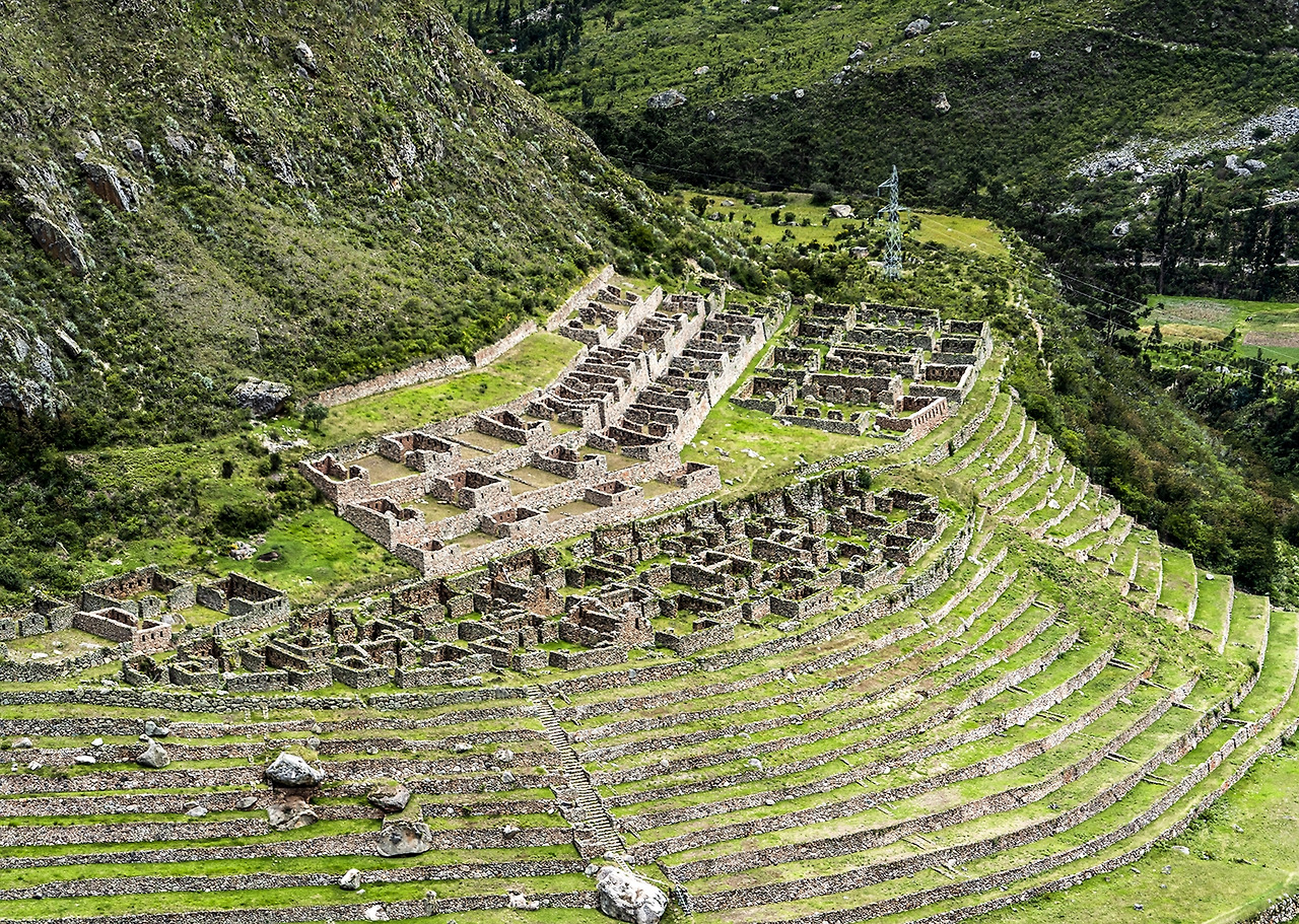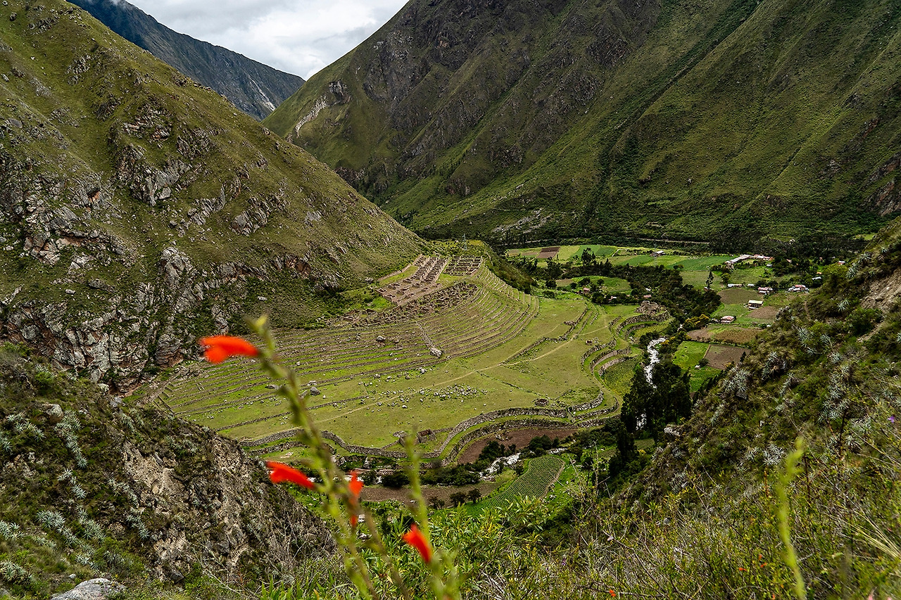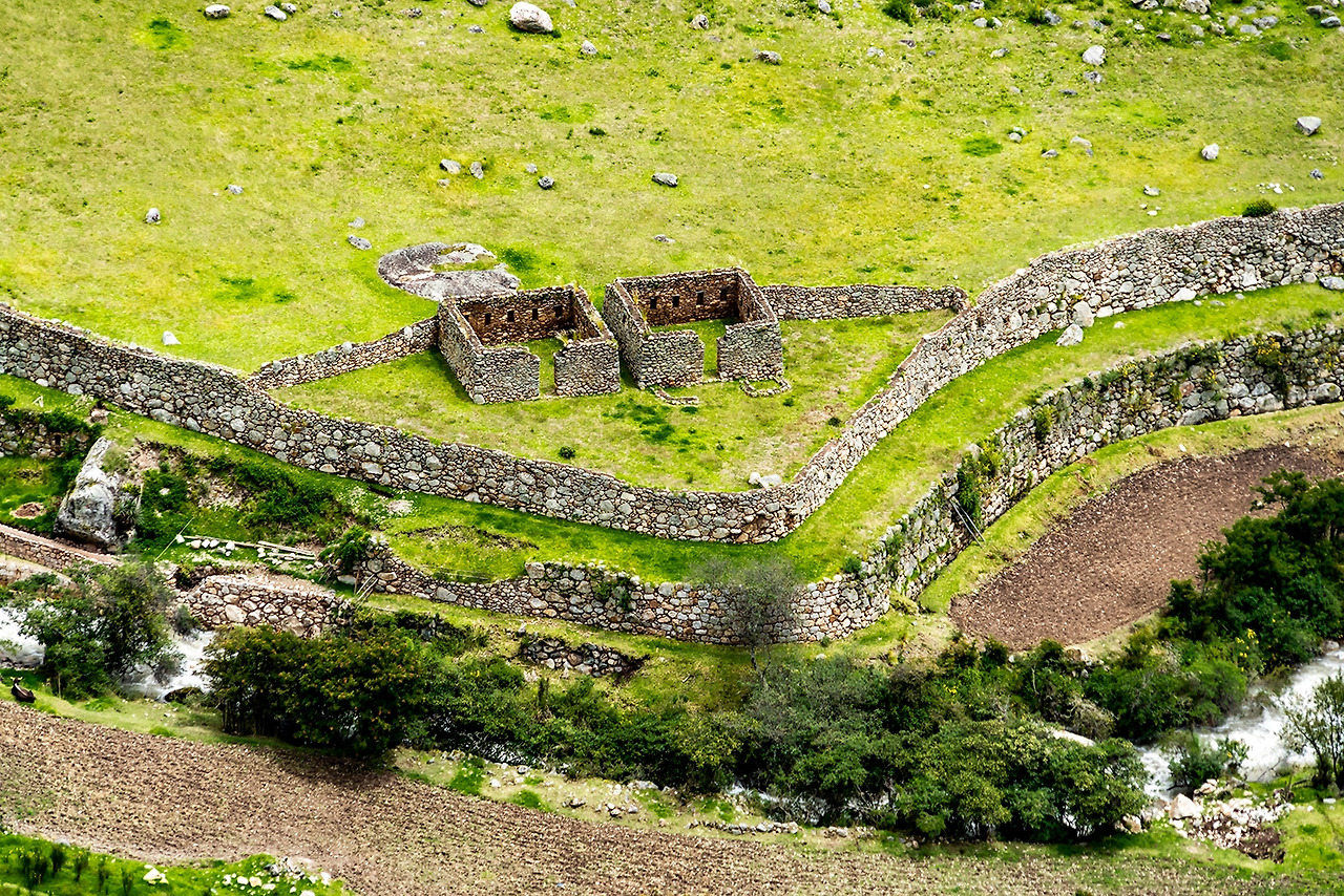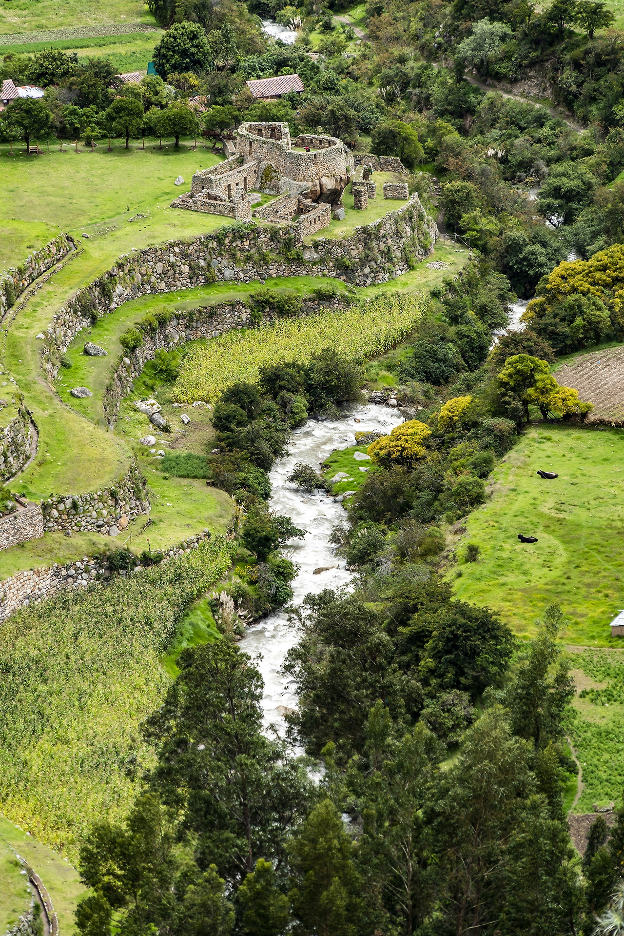 그렇게 얼마를 올랐을까 깎아지른 듯한 급경사의 산 능선 밑으로 쿠시차카 강이 S자를 그리며 흘러 내려가고 그 강 건너에 널찍한 푸른 들판의 충적대지가 펼쳐져 있었다. 그리고 푸른 들판 저 뒤 산 밑으로 수많은 건물지가 보였다. 건물들은 돌벽만 남아 번성했던 잉카의 옛 역사를 흔적만 남은 채로 우리 앞에 드러내고 있었다.