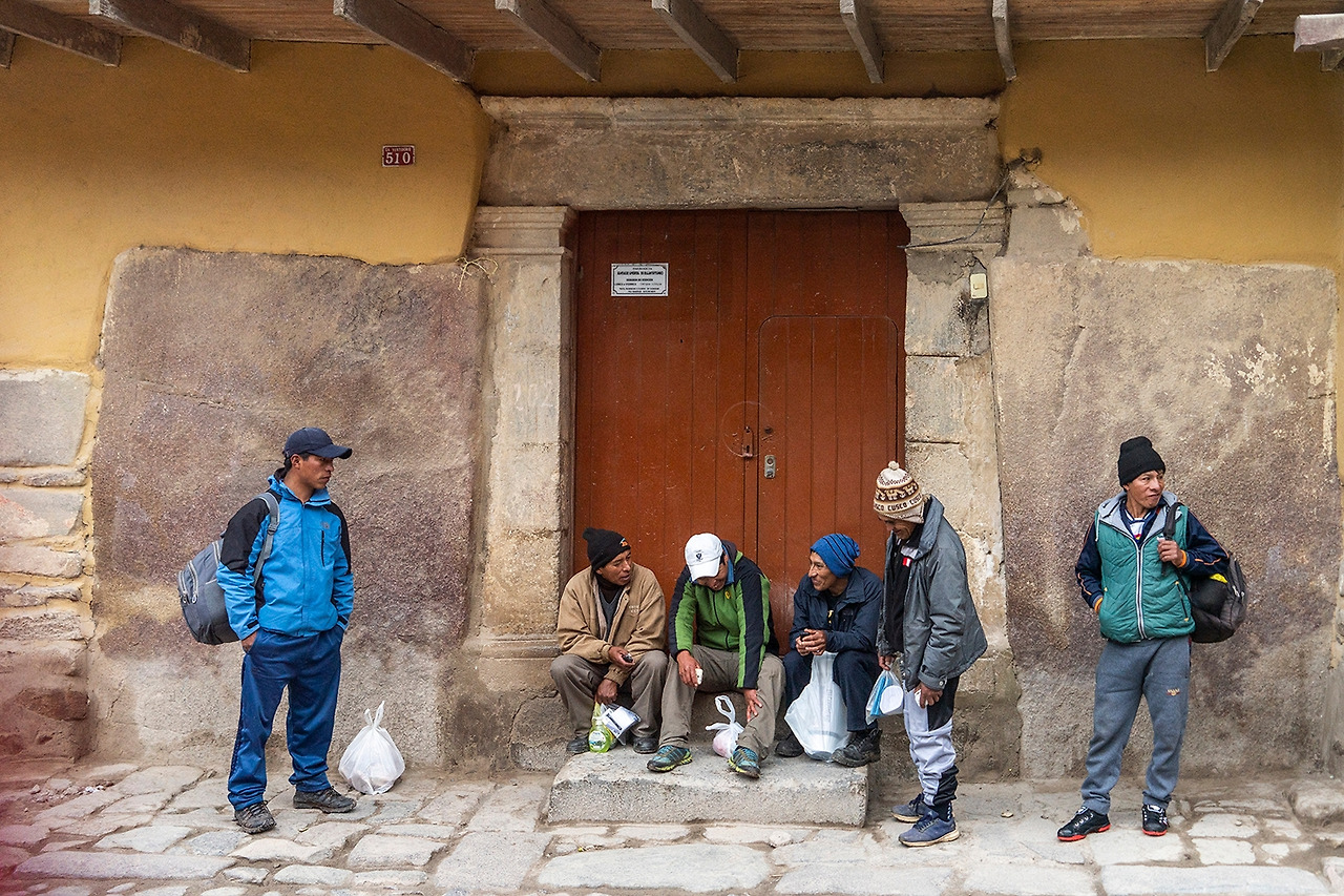 피스카쿠초 마을에서 버스를 기다리는 남자들. 이 건물은 스페인 풍이지만 벽으로 사용된 커다란 돌은 잉카 유적에서 옮겨온 것이다.