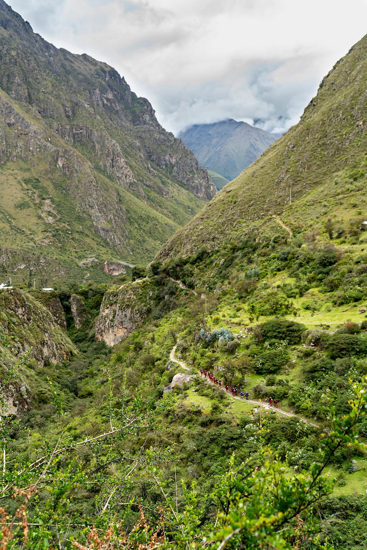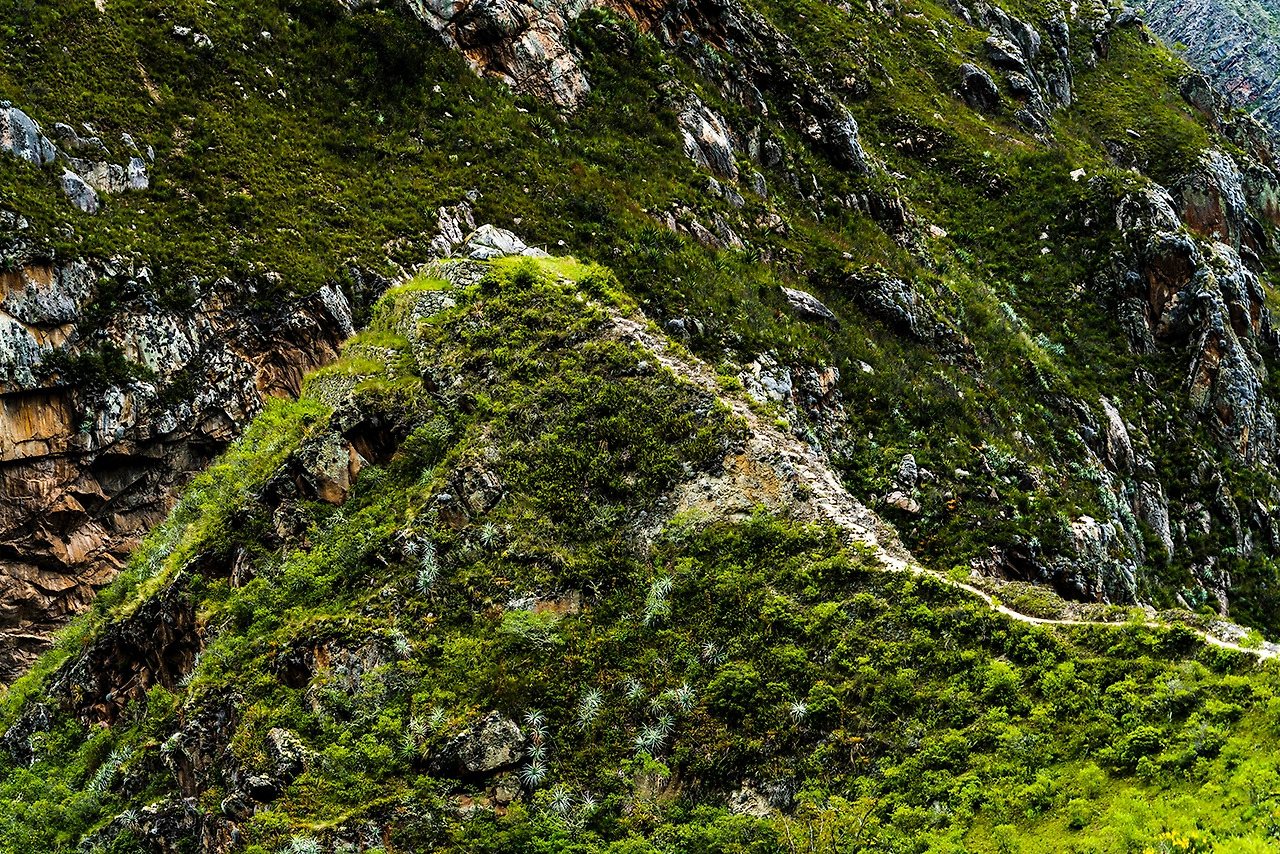 출발지점에서 강을 따라 가면 선인장 꽃을 비롯해서 아름다운 꽃들이 길 양쪽으로 피어 있는 빨간 샐비어 꽃들 사이로 벌새들이 날아다닌다. 길이 강가를 벗어나 능선 위로 오르면 우루밤바로 흘러드는 쿠시차카 강이 저 밑으로 흐르고 강 가에 여기저기 잉카의 옛터에 돌담들이 서 있다. 이렇게 아름다운 산길이 또 있을까 싶은 그런 길이었다.