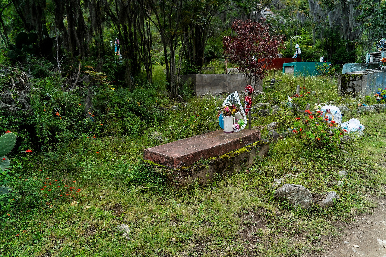 길 가의 묘지에 예쁜 꽃이 놓여 있다.