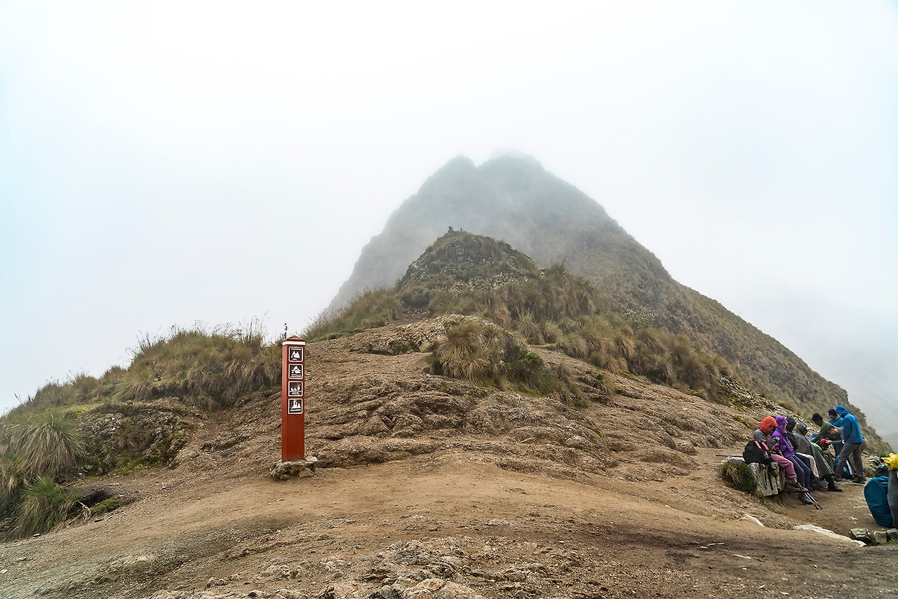 지루한 고갯길을 얼마나 걸었을까? 안갯속에 한떼의 트래커들이 휴식을 취하고 있는데 고개는 거기서 내리막길로 바뀌었다. 해발 4215미터의 죽은 여인의 고개라고 부르는 고갯마루였다. 죽은 여인이라는 고개의 이름은 이 고개의 능선을 멀리서 볼 때 여성의 나신이 누워 있는 것처럼 보인다고 해서 붙은 이름이라고 했다.