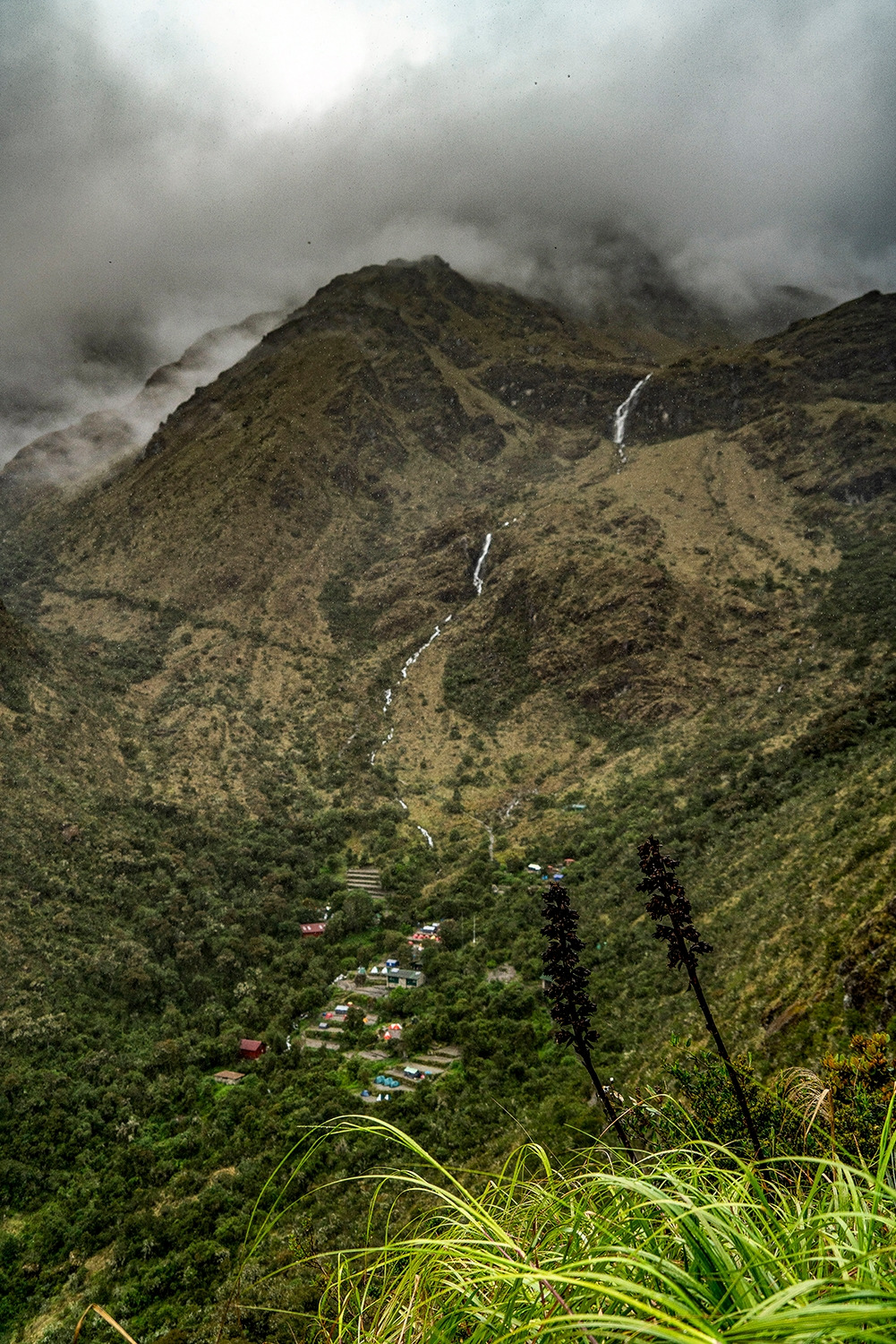 멀리 내려온 길이 보이고 계곡 아래에 파카이마유 캠프장이 보이고 그 위로 산꼭대기에서부터 아래로 길게 떨어지는 폭포수가 하얀 띠처럼 보였다. 4000미터를 오르내리는 고산지대라 나무가 없어 야생화들만이 안갯속에 드러났다.