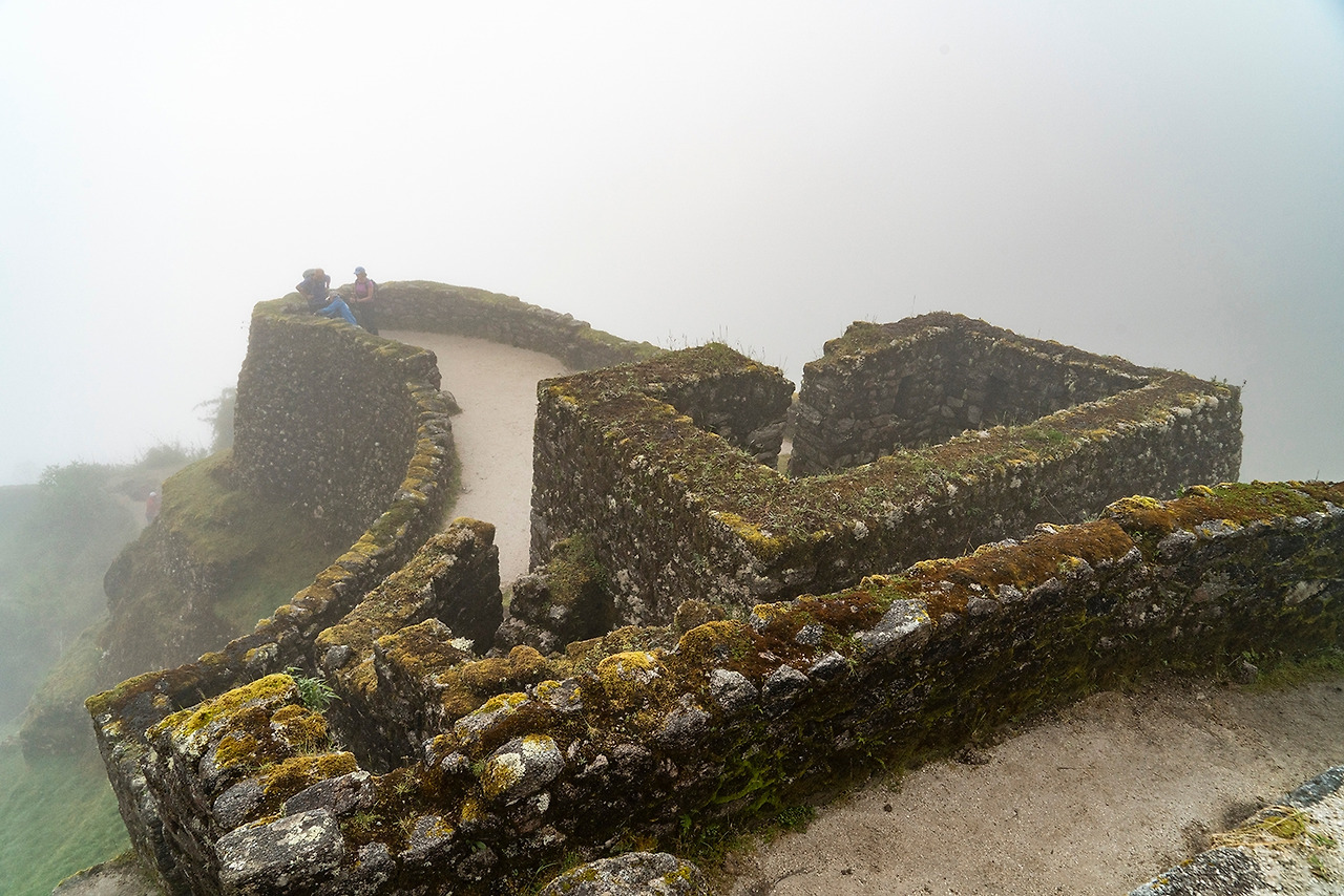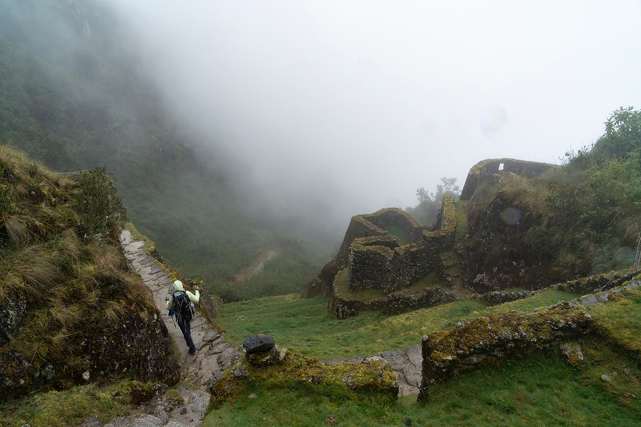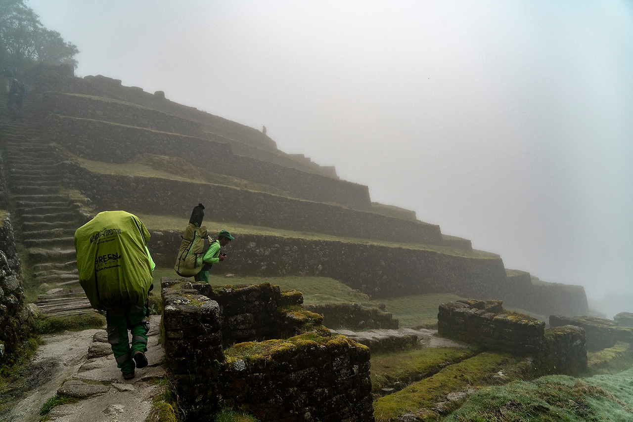 안갯속에 포터들이 푸유파타마르카 유적을 지나간다.