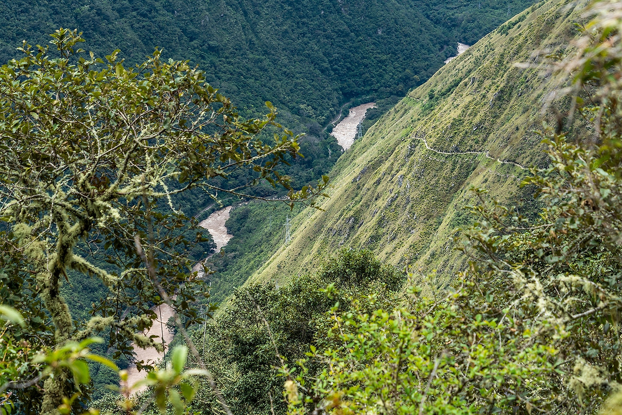 마추픽추 유적으로 연결되는 우루밤바 강이 협곡을 이루고 급경사의 사면에 실낱같은 길이 보인다.