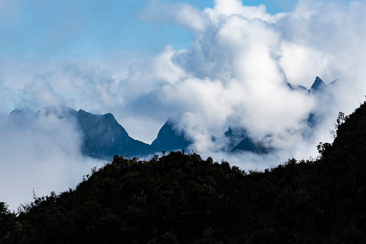 트레킹 중에 보는 건너편 안데스 연봉이 안개 속에서 나타났다가 사라진다.