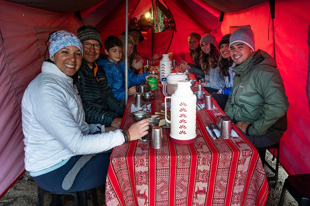 아침 식사를 위해 트레킹 팀원들이 테이블에 모였다.