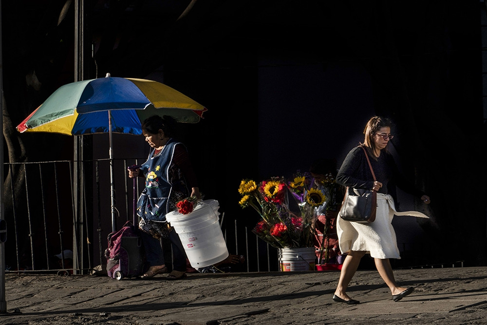 꽃 파는 아주머니와 직장여성의 대비, 전통적 주황색 벽과 최신 건물의 유리벽에 비친 이미지가 역사적 도시의 냄새를 짙게 풍긴다.