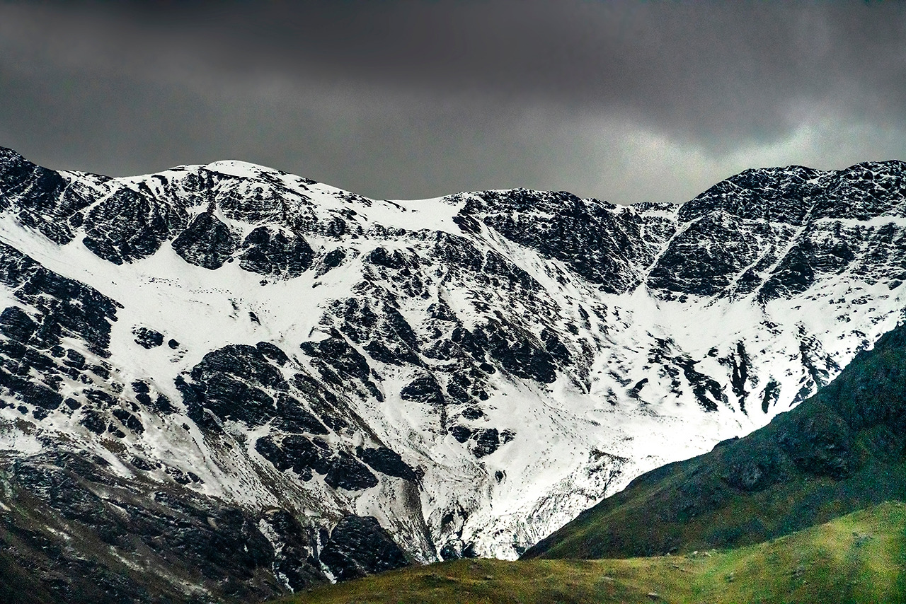 길 옆의 녹색 언덕의 배경으로 서 있는 눈 싸인 산 줄기가 이곳의 지리적 환경을 대변해준다.