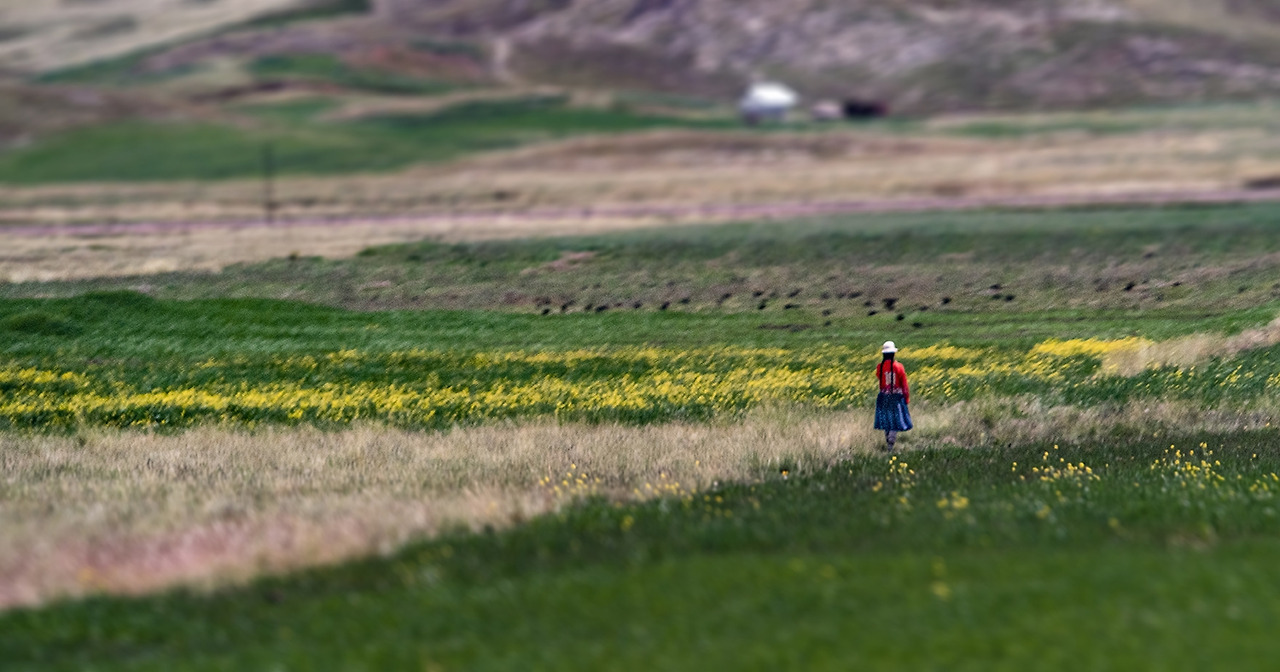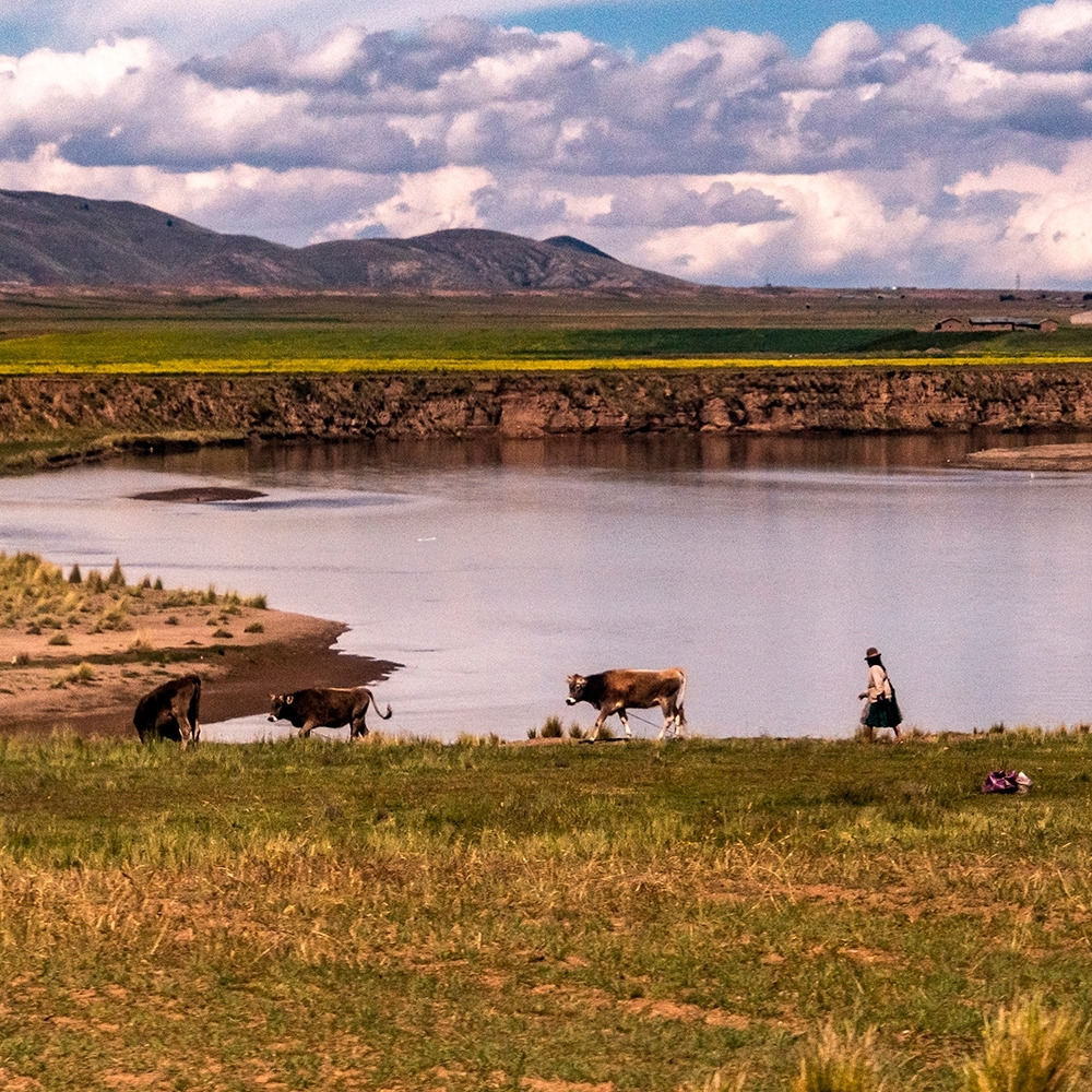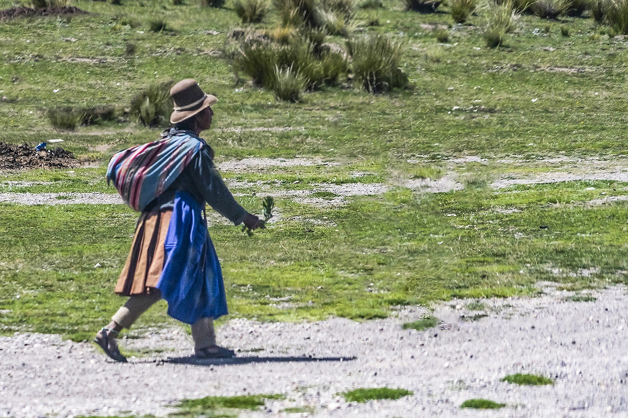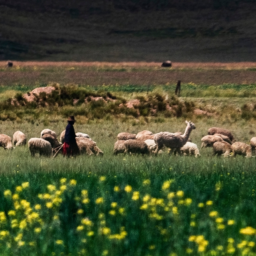 양치는 여인. 야마와 면양이 섞여 풀을 뜯는 것이 흥미롭게 보인다. 야마가 보이는 것으로 보아 이곳이 해발 4000미터보다 높은 곳이 아닐까 생각된다.