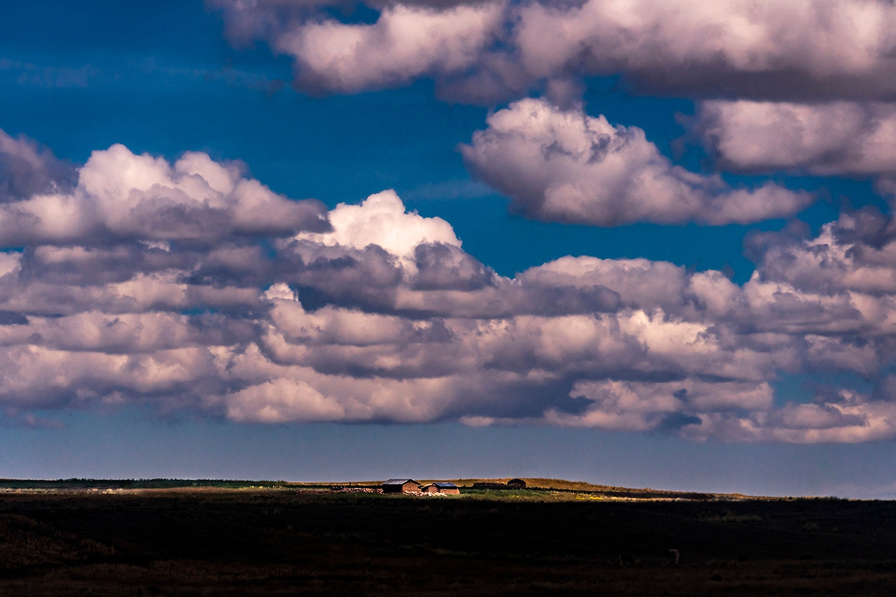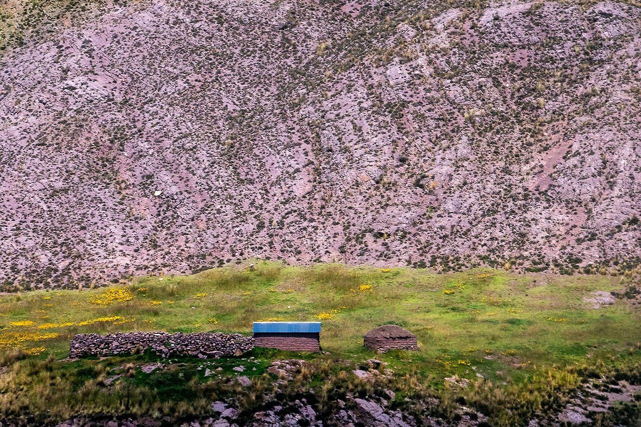 농가인지 창고인지 알 수 없는 집 뒤로 푸른 풀밭의 능선이 뒤의 붉은색 산의 급경사면과 어울려 그림이 되었다.