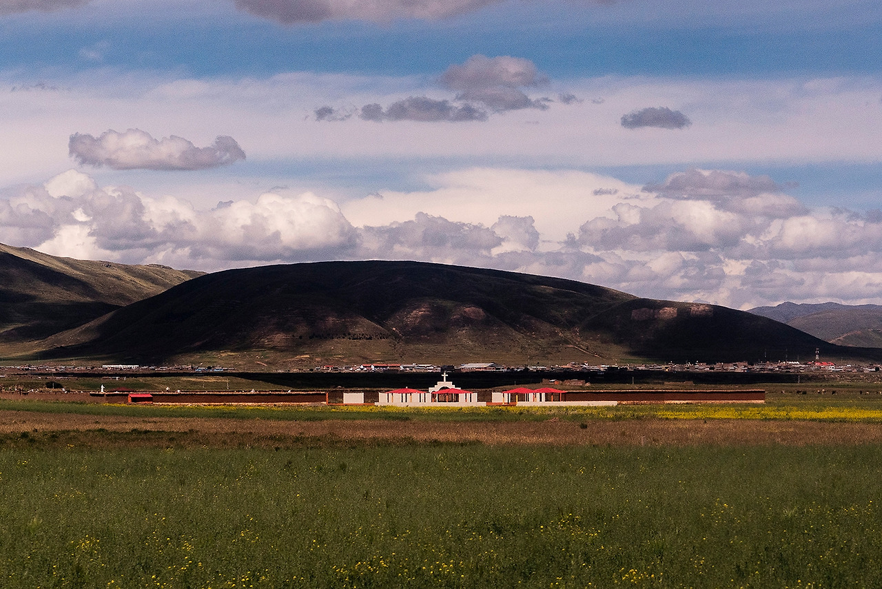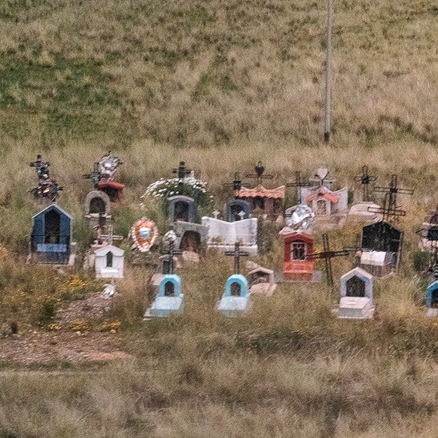 긴 담과 그 중간을 차지하고 있는 붉은 지붕에 흰 담 그리고 큰 십자가 있는 건물이 푸른 풀밭과 뒤의 검은 산을 배경으로 아름답게 어울린다. 아마도 공동묘지일 것이다.