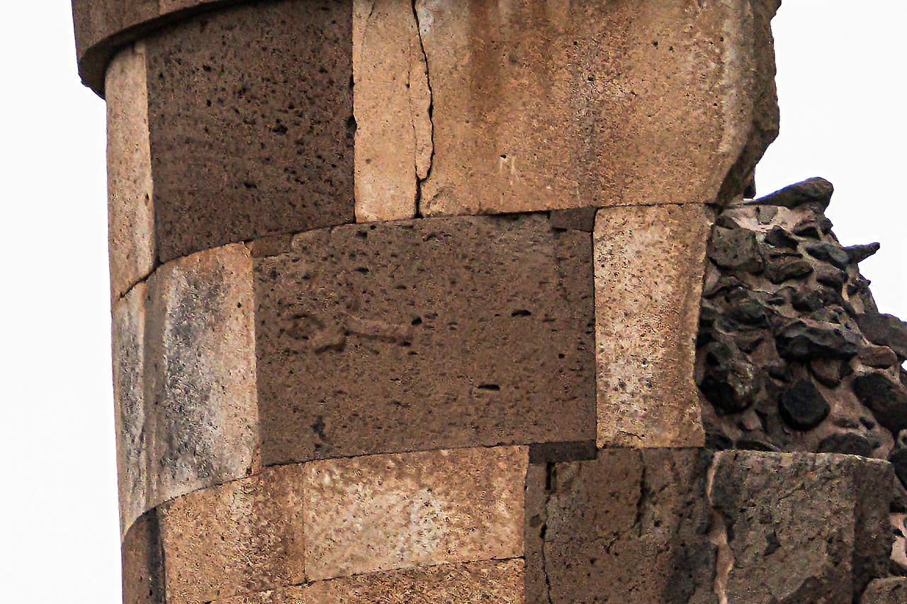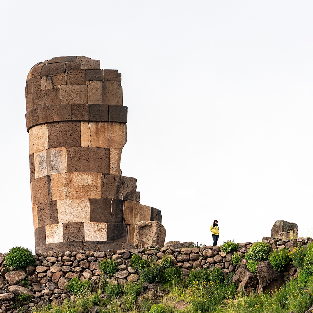 주차장에서 얼마 안가 마주한 언덕 위에는 위가 벌어진 원통형의 탑이 하늘을 배경으로 우뚝 서 있었다. 그것은 매우 인상적이었는데 멕시코에서도, 또 페루에 도착한 후에도 보지 못하던 풍경이었다. 탑의 표면은 흰색과 짙은 갈색의 돌을 직육면체로 잘 다듬어 쌓아 올린 것인데 어둡고 밝은 돌의 색깔이 마치 직사각형을 이용한 모자이크 작품 같았다.