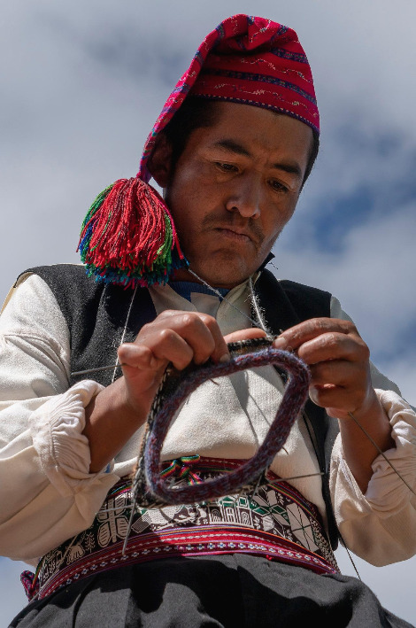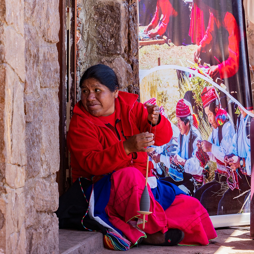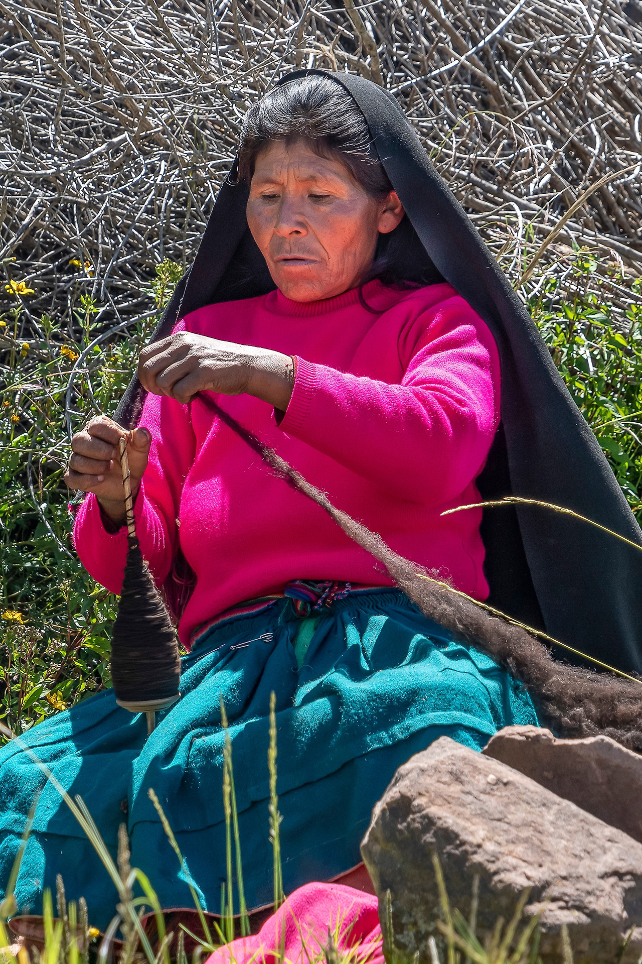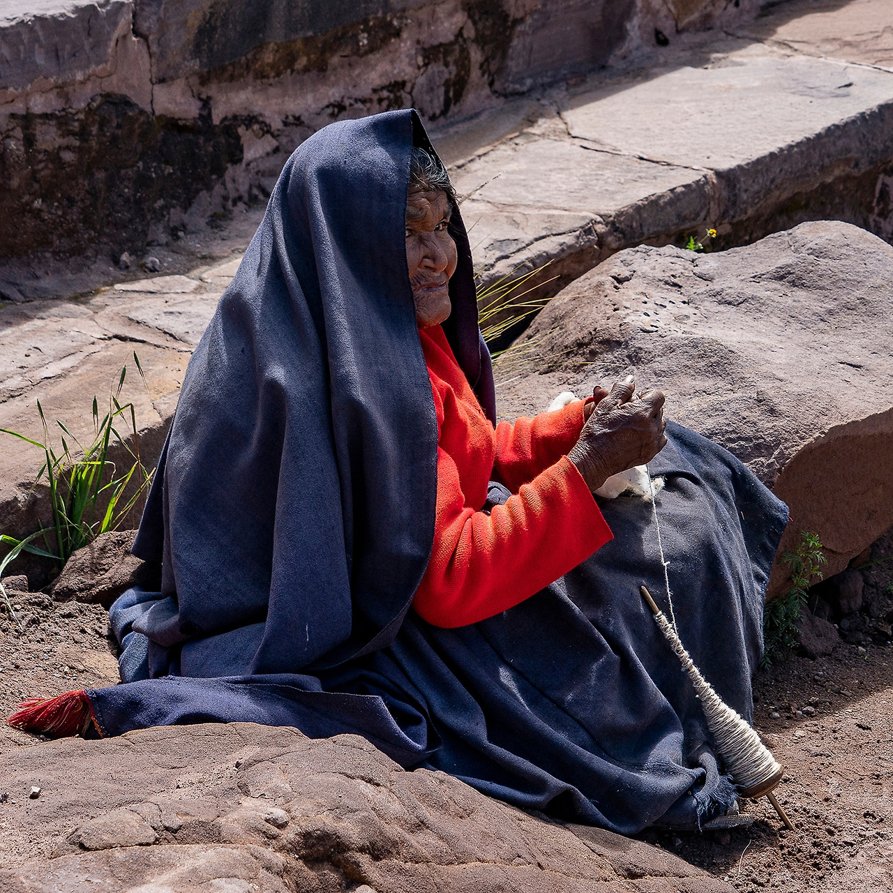 타킬레의 나이 든 여성들은 어디서나 앉으면 방추자를 돌려 양털에서 실을 뽑는다.