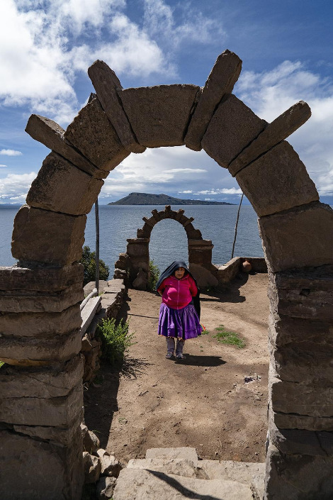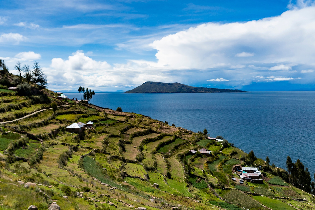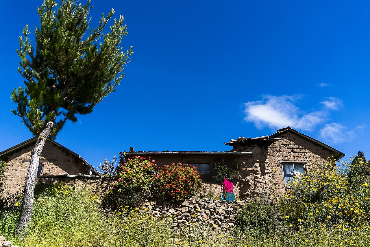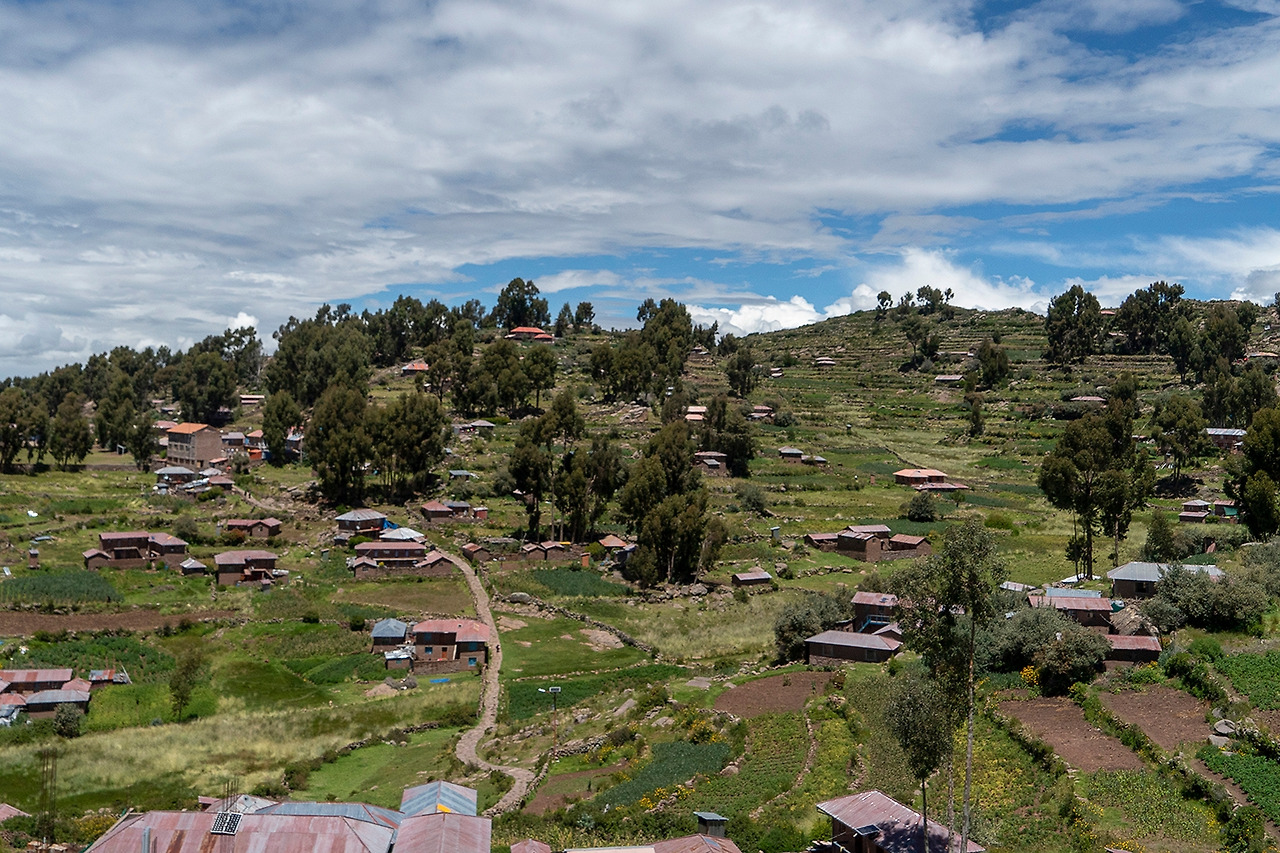 중앙 광장을 중심으로 한 마을의 집들이 있는 해발고도는 호수면에서 약 150미터 올라온 3950미터 정도이며 섬에서 가장 높은 곳은 4050 미터라고 한다.