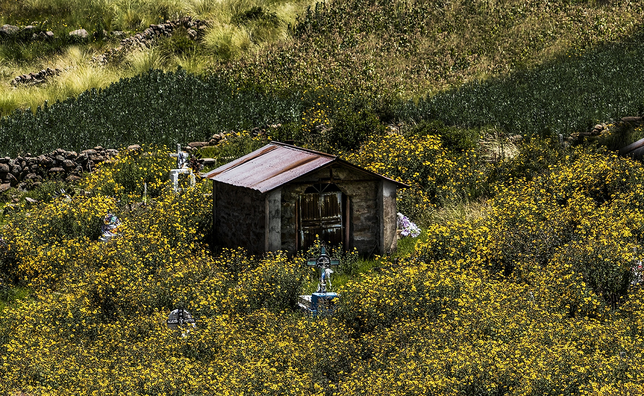 노란 꽃들에 둘러싸인 마을 공동묘지