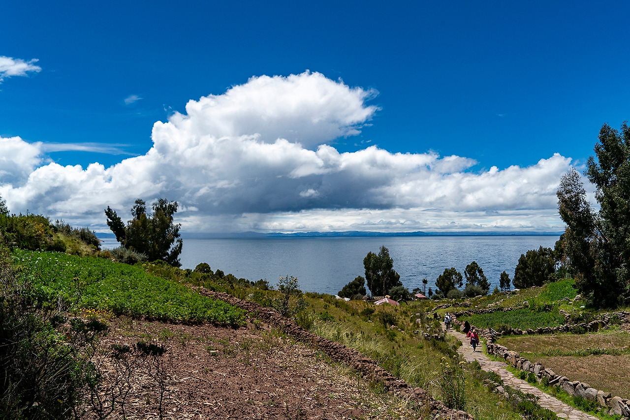 선착장에서 마을로 올라오는 길에서 본 티티카카 호수의 풍경. 섬의 곳곳에 유칼립투스 나무가 많이 보이는데 육지에서 반입된 것들이다.