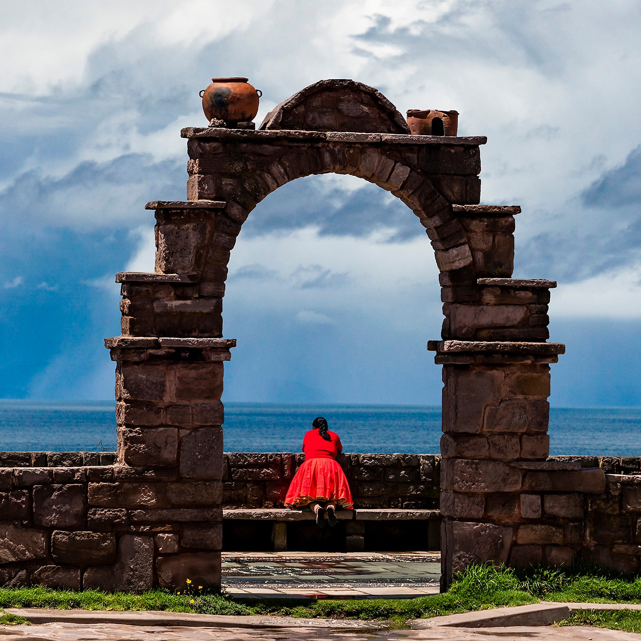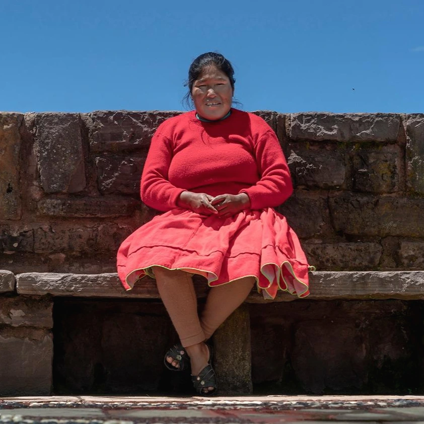 타킬레를 대표하는 붉은색 셔츠와 치마로 편안히 휴식을 취하고 있는 여성의 모습