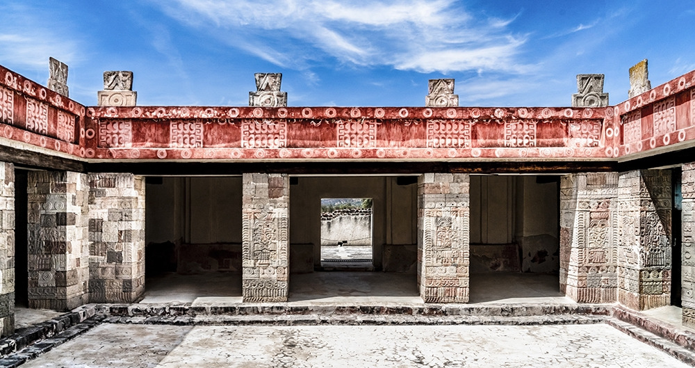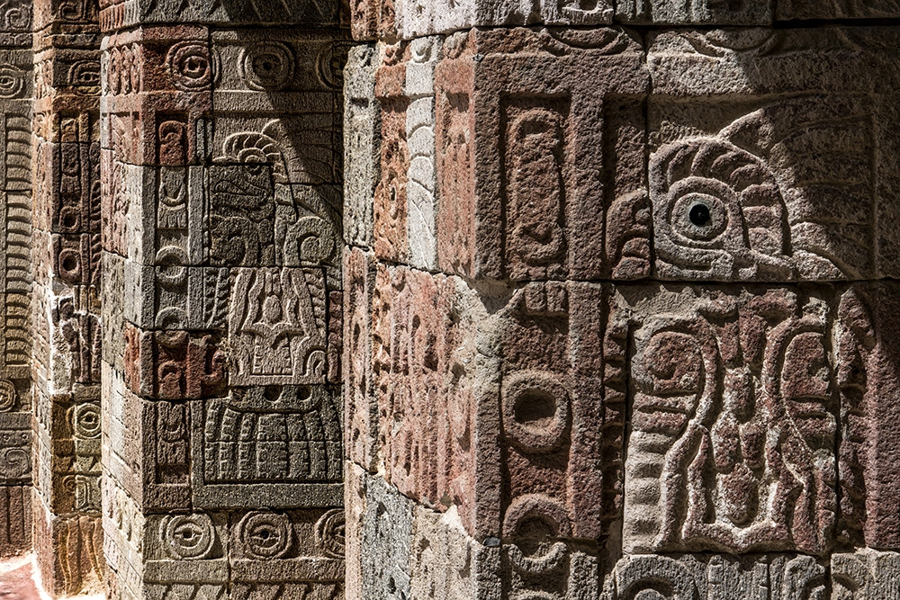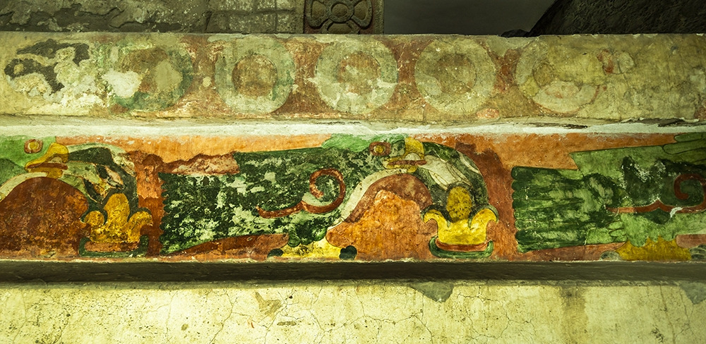 달의 피라미드 앞에는 화려한 조각이 새겨진 사원 건물이 있다. 사원의 내부에는 새가 새겨진 기둥의 회랑으로 둘러싸인 작은 내정이 있다. 황색끼가 도는 기둥과 그 위에 사방으로 돌아가는 붉은색의 벽화, 그리고 짙푸른 하늘이 만들어내는 공간 배치는 놀랍도록 아름답다. 기둥에 새겨진 새의 조각은 연하고 짙은 붉은색 돌과 흰색의 돌을 짜 맞추어 마치 정교한 채색화를 보는 듯하다. 당시 마야의 사람들이 가진 미적 감각은 놀랍기만 하다.
