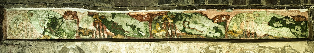이 사원의 내부에는 많은 벽화가 있는데 흥미로운 것은 파랑새들의 행렬이다. 노란색 부리가 앵무새처럼 꼬부라져 있고 부리 아래 노란 꽃이 보인다.
