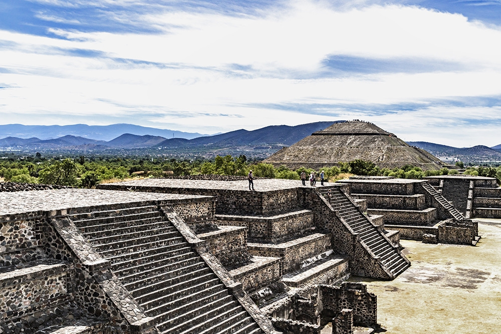 달의 피라미드 앞에도 많은 제단 피라미드들이 있다. 그 하나의 피라미드 정상에서 보면 죽은 자의 길 뒤로 보이는 맞은편 산의 봉우리들도 마치 거대 피라미드처럼 보인다.