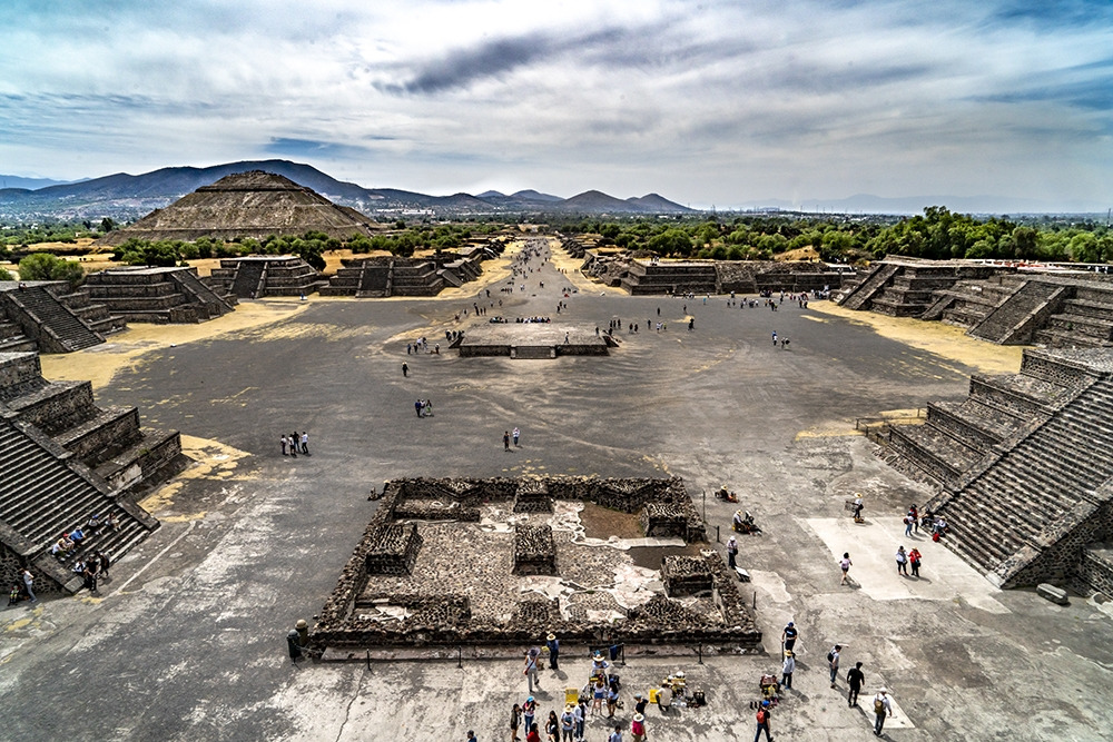 달의 피라미드에서 본 죽은 자의 길. 멀리 왼쪽으로 태양의 피라미드가 보이고 길 양쪽으로 많은 제단들이 보인다. 달의 광장이라는 앞의 넓은 광장은 우주적 질서가 구현되었다고 한다.