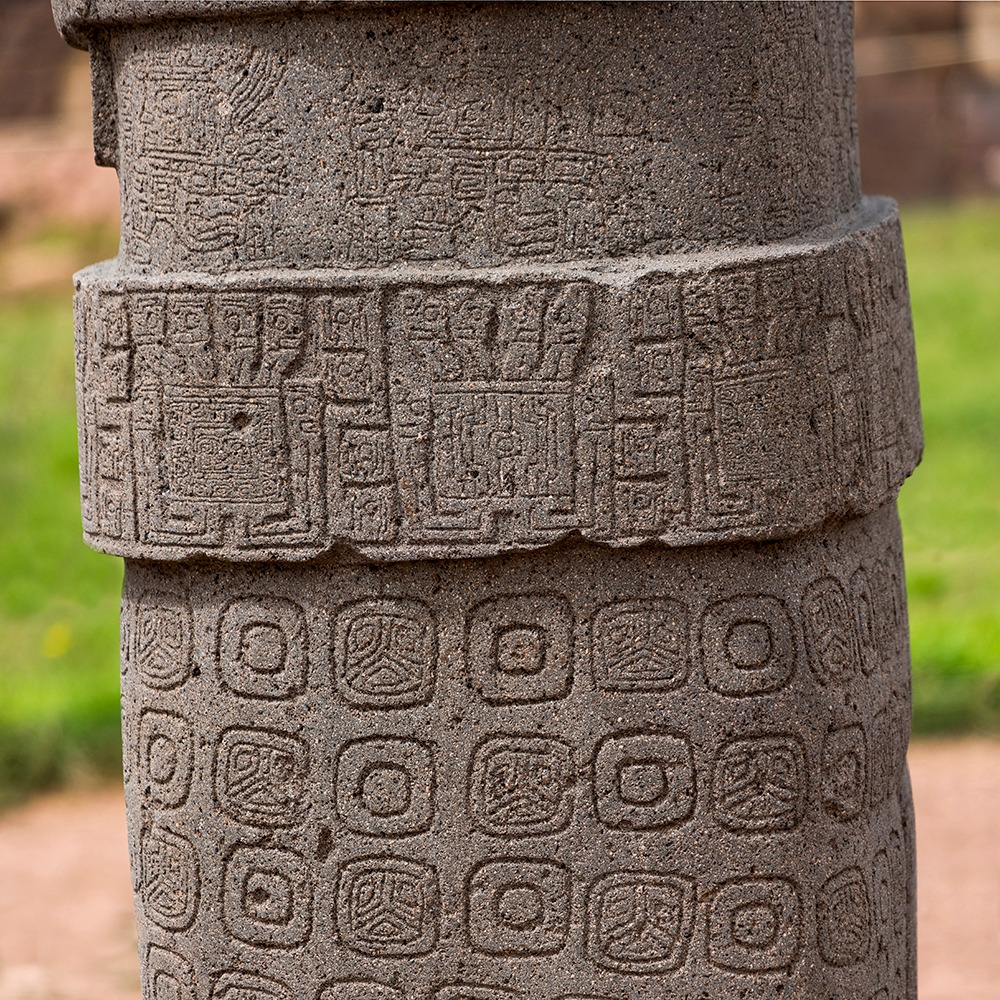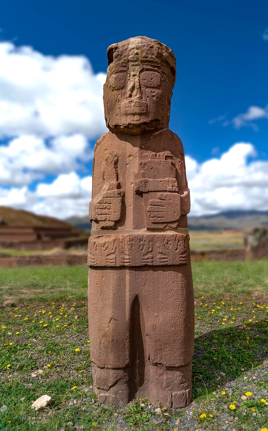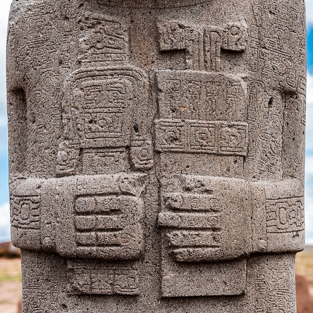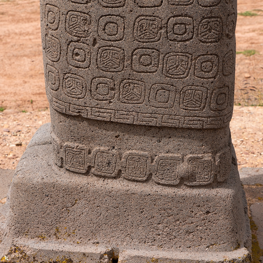 다리를 감싼 치마 같은 옷에는 폰세 석상과 마찬가지로 신상의 얼굴을 극도로 간략화한 것과 이중의 사각형 무늬를 반복해서 새겼다. 석상의 세부를 자세히 기록하느라 길고 지루해졌으나 티와나쿠 사람들이 왜 이 석상들을 숭배했는지를 이해하는데 도움이 될까 해서였다. 한편으로는 이런 시시콜콜한 것들을 들여다보는 것이 나의 취미이기도 하니 어쩔 수 없다.
