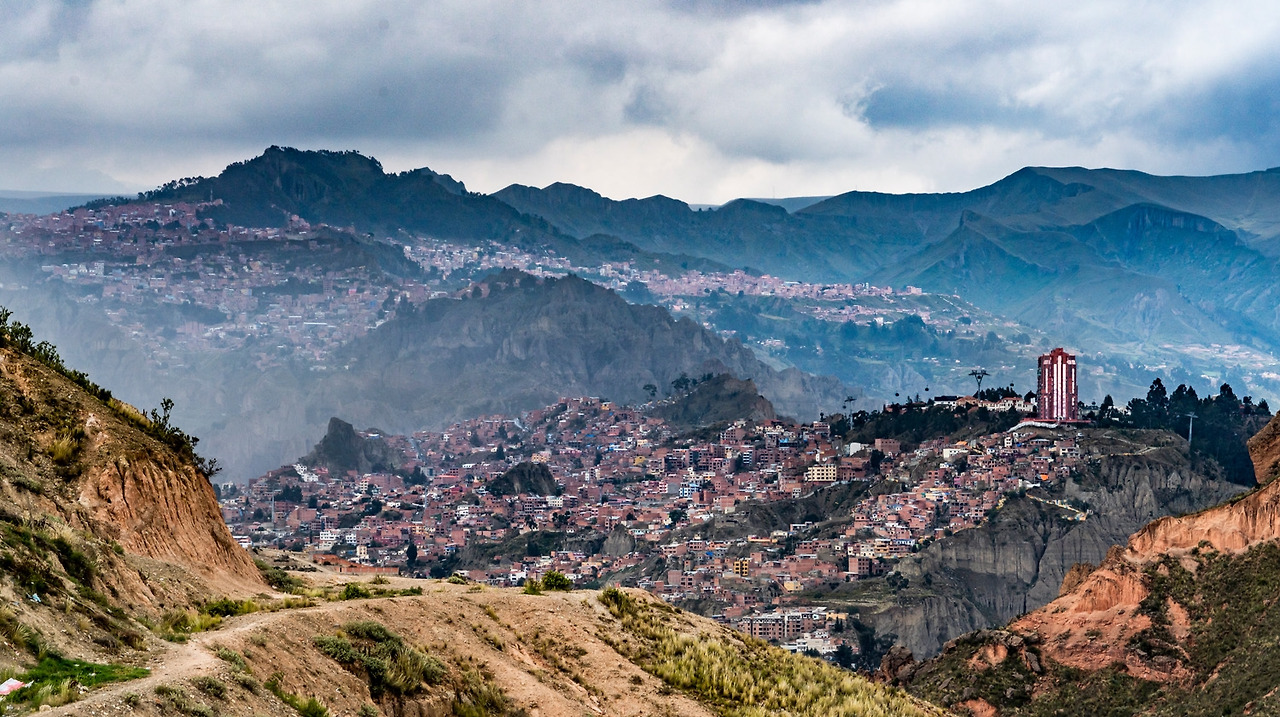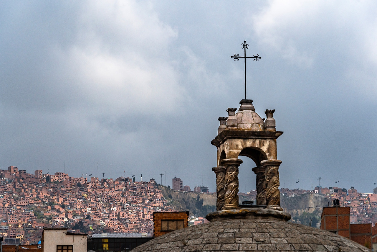 성당 중앙 돔 뒤로 라파스의 달동네들이 상자를 겹쳐 쌓은 듯 위태롭게 보인다.