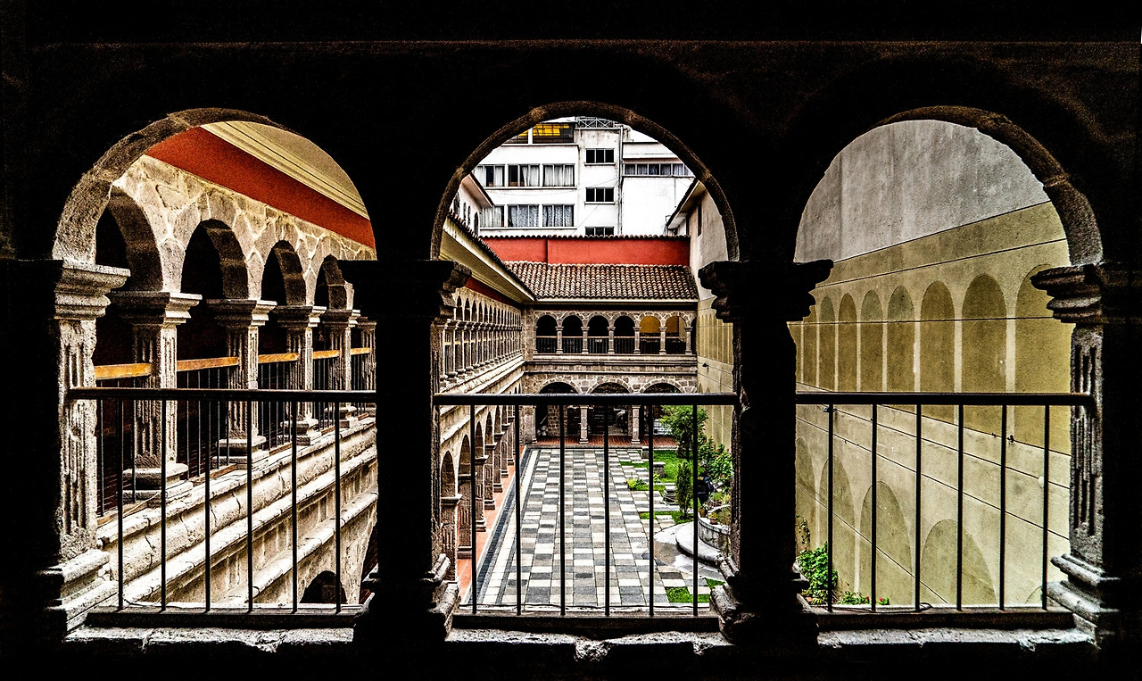 2층 회랑 아치 문을 통해서 본 회랑 전경. 오른쪽의 녹색 회랑 벽호가 맞은편 실제 회랑과 멋지게 어울렸다.