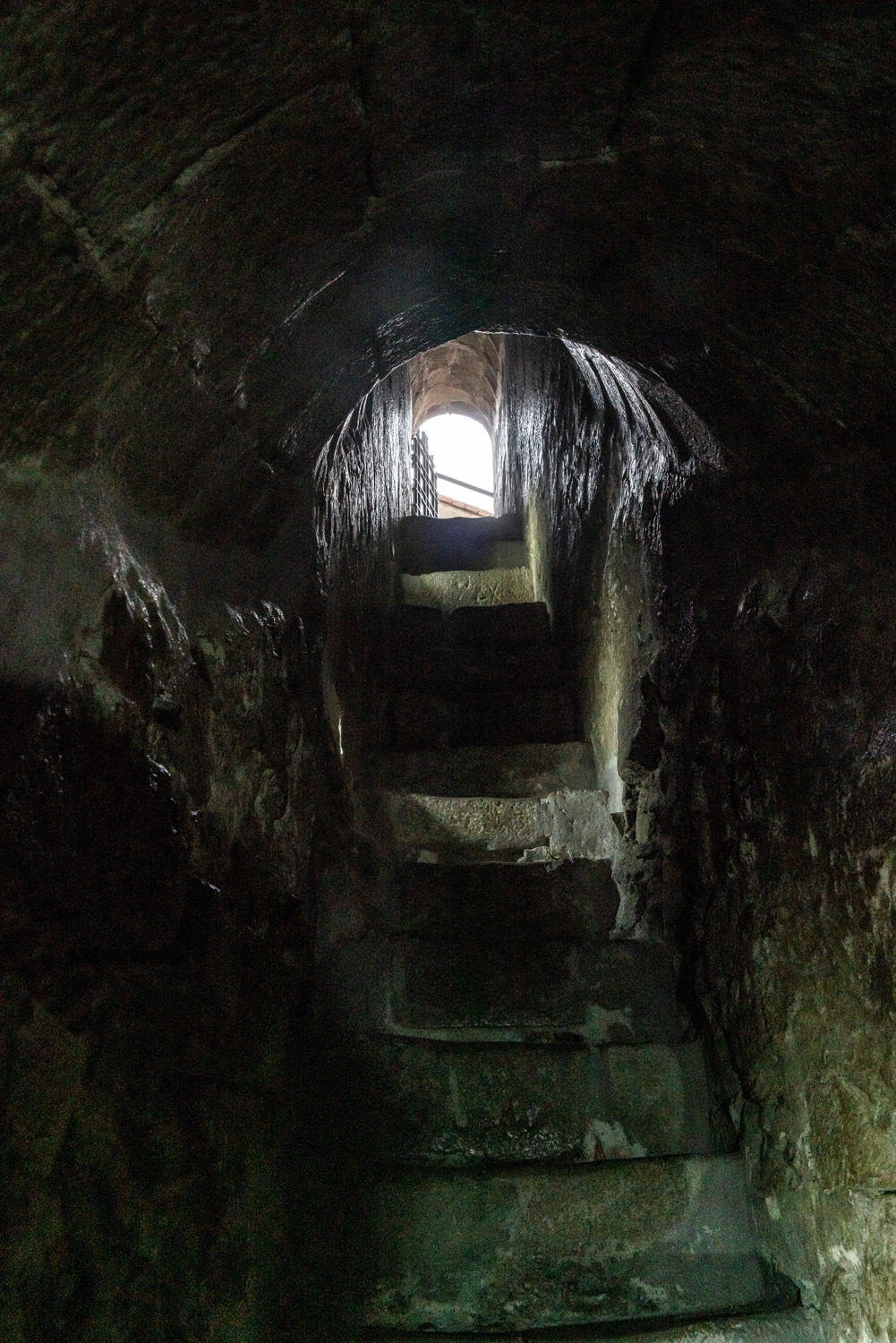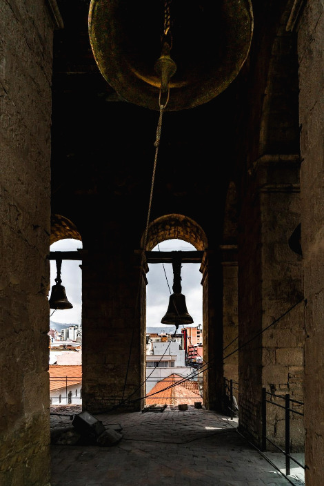 종탑으로 오르는 터널과 종탑에 매달린 종들