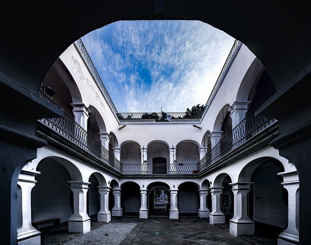 로스 핀토레스 박물관의 안마당. 하늘이 천장에 걸어 놓은 쪽빛 면포처럼 보인다.