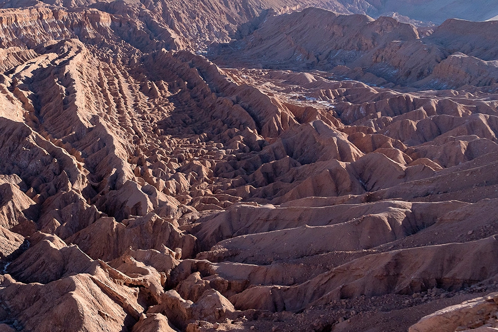 전망대에서 내려다 보이는 주름진 붉은 바위산들과 물이 말라버린 산 페드로 강