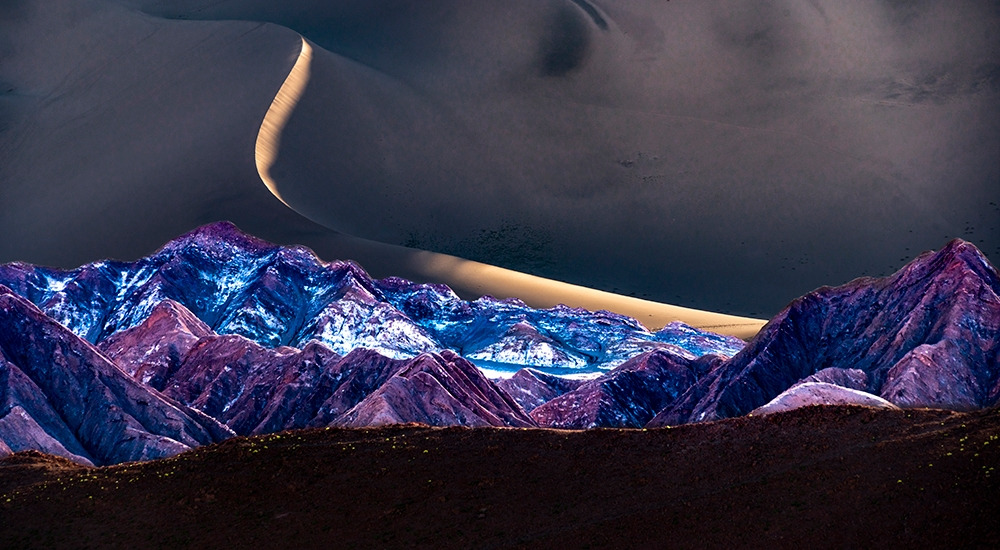 데스 밸리의 붉은 산과 뒤의 모래산 칼날 능선에 석양이 비치고 있다.