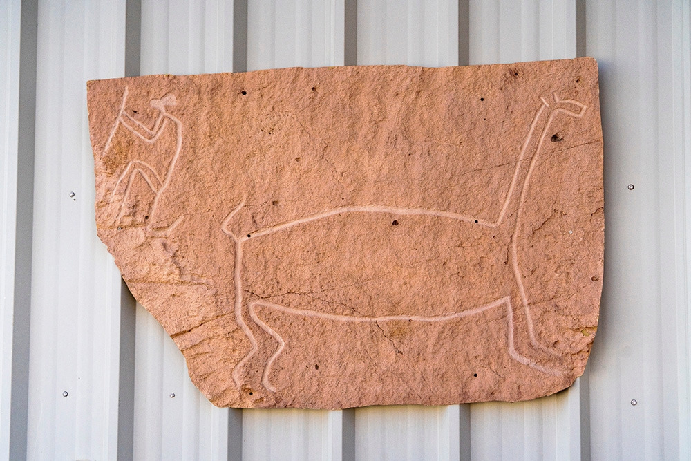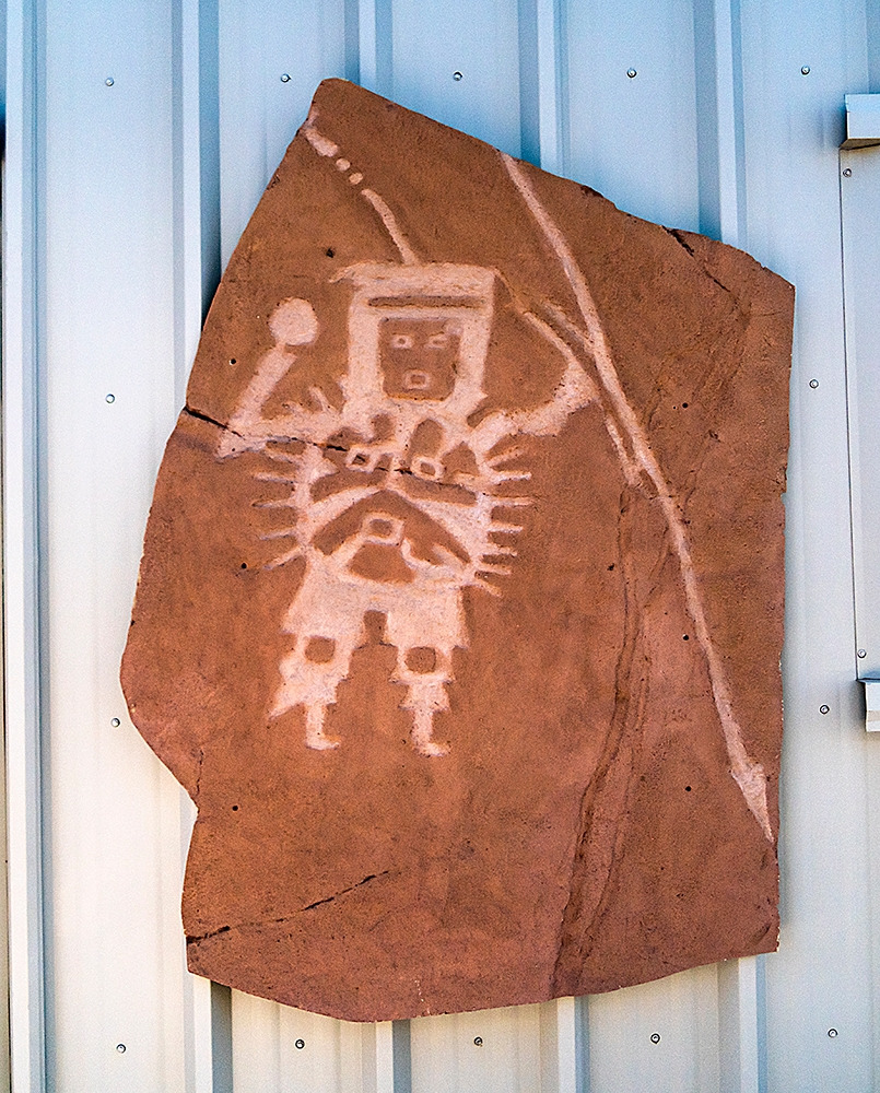 박물관 벽에 걸린 암각화 복제품 일부. 위의 왼쪽 구석에 등이 굽은 인물이 있는데 이는 미국의 서남부 사막에서 흔히 볼 수 있는 소위 코코펠리라고 하는 인물상이다.