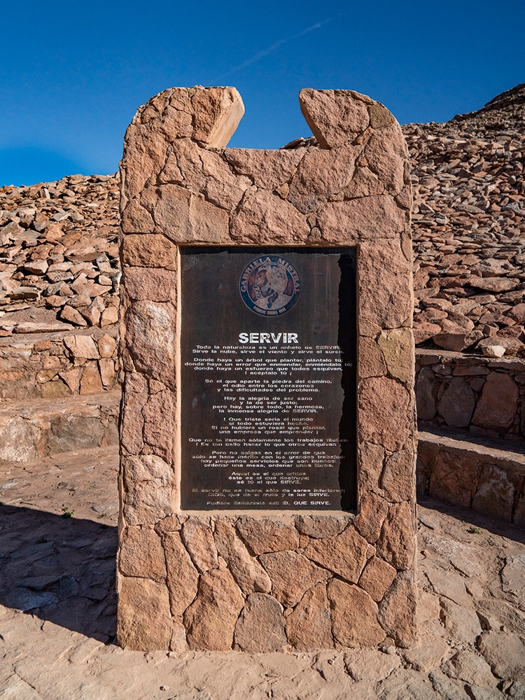 가브리엘라 미스트랄의 시비. 봉사(SERVIR)라는 시 제목이 보인다.