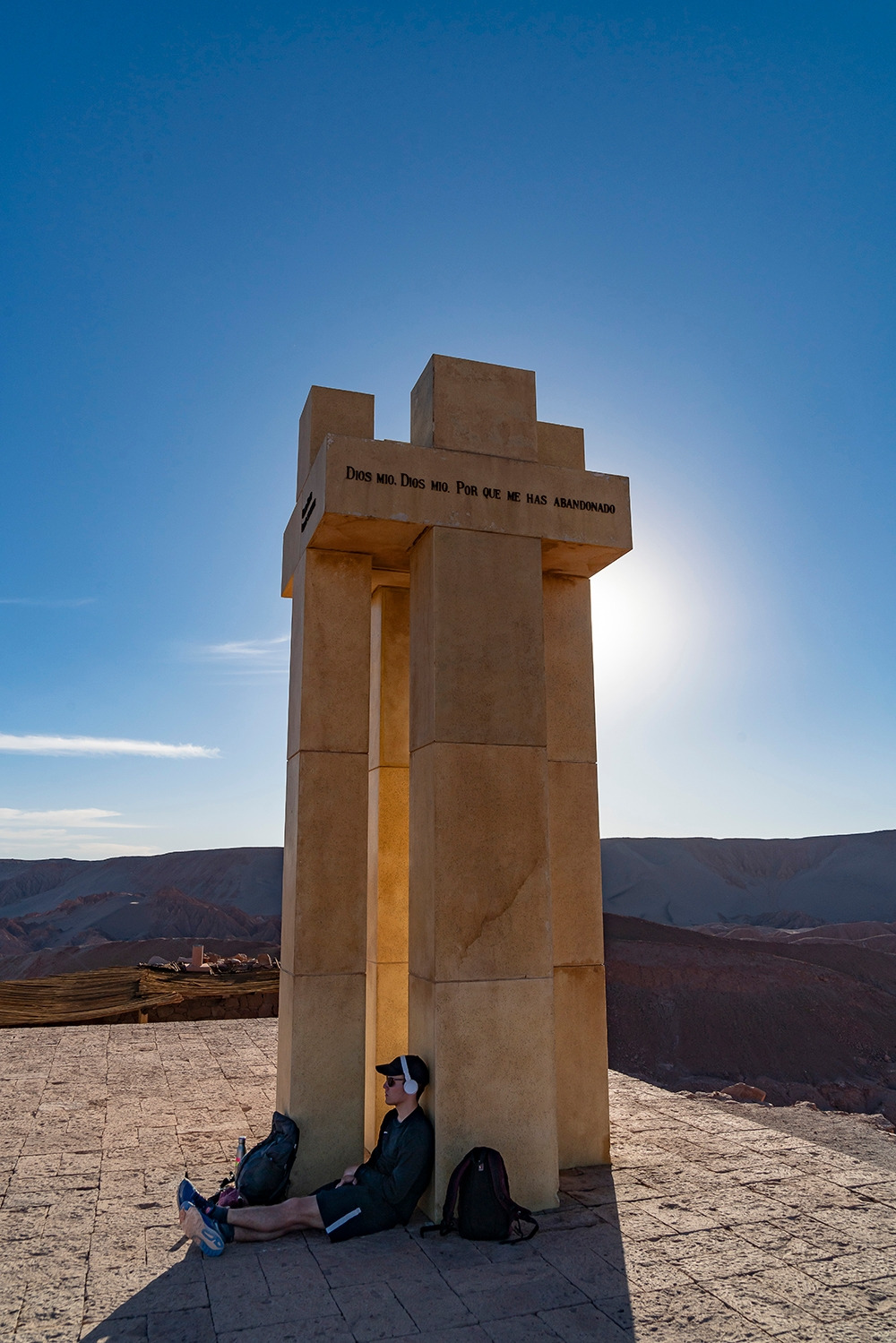 남미는 어느 나라나 할 것 없이 산 위 높은 곳에는 큰 십자가를 세워 놓았다. 천국과 가까운 곳이라서 그럴 것이라고 생각했다. 십자가 위에는 '나의 하나님, 나의 하나님, 왜 나를 버리셨나이까?'라는 문구가 새겨 있다. 예수가 십자가에 매달려 하나님을 향해 했다는 말이다. 왜 하필 이 귀절일까는 내 능력으로 알 수가 없다. 십자가 그늘 밑에는 여행에 지친 몸을 누이고 땀을 식히는 젊은이가 있었다.