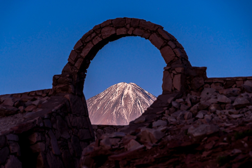 산책길 중간의 새로 쌓은 성문을 통해 보는 안데스의 리칸카부르 화산