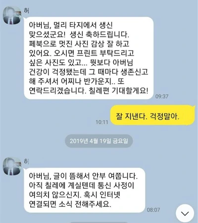 페이스북 피드에 마지막으로 올린 일지와 사위가 보낸 카카오톡 메시지. 사위는 이 메시지의 답을 받지 못하자 나의 신변에 이상이 생겼음을 직감했다.