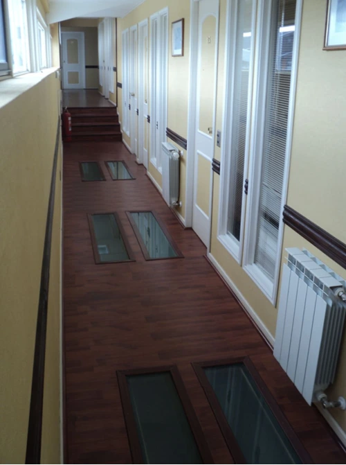 호텔 기예르모의 2층 복도. 벽에 긴 유리창이 두 개씩 설치되어 있다.(www.hostaldonguillermo.com/ 캡처)