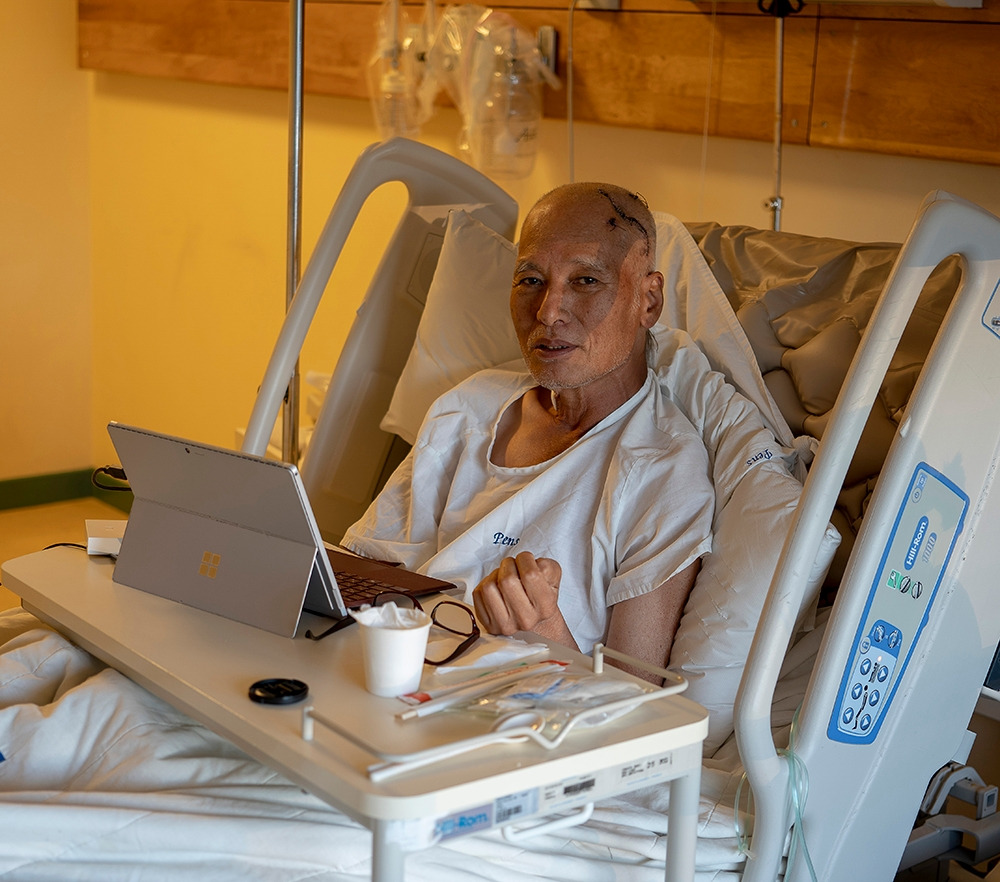 아직 중환자실이지만 팔목에 붙어 있던 주삿바늘이 모두 제거된 것으로 보아 상태가 상당히 좋아진 것을 알 수 있다. 머리에 길게 두개골 절단 후 봉합한 흔적이 보인다.