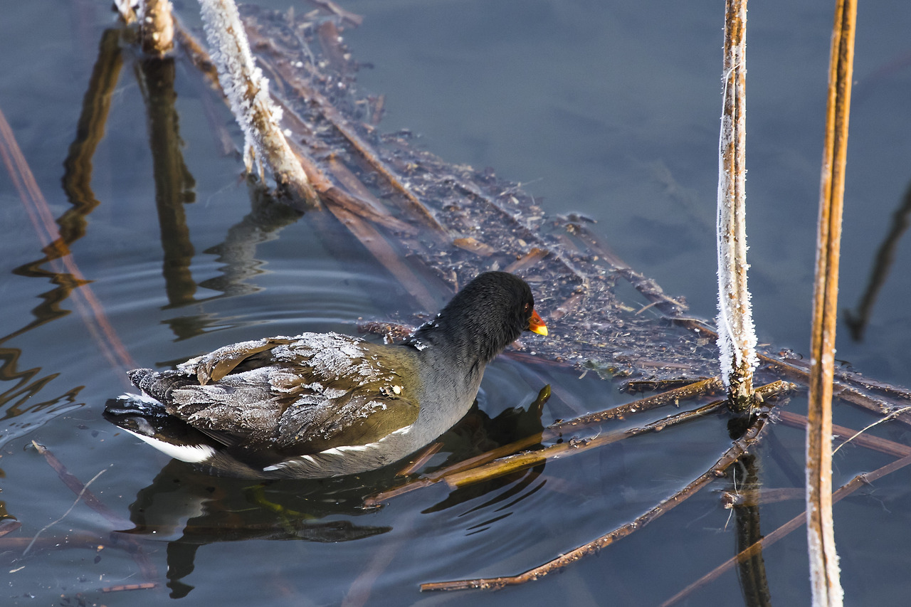 겨울 아침 날개에 서리를 덮어쓴 채 물 위를 헤엄치는 쇠물닭