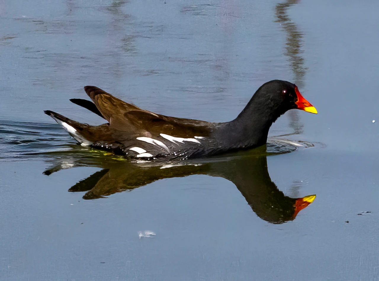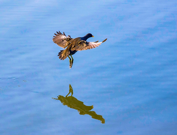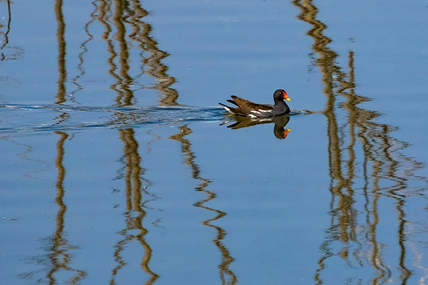 강 언덕의 나뭇가지 반영을 흩뜨리며 헤엄치는 쇠물닭이 멋진 추상화를 그린다.