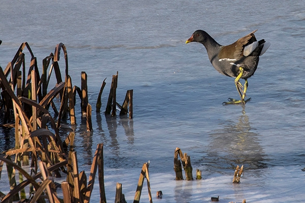 이렇게 나는 추운 겨울 아침 쇠물닭과 첫 만남을 가졌다. 페이스북에 사진을 올리고 새이름을 물었더니 페이스북 친구도 아닌 어떤 분이 고맙게도 쇠물닭이라는 석자의 답글을 달아 주었다. 인터넷 검색으로 알아본 이 새의 정보에는 여름 철새라고 되어 있었다. 그런데 한 겨울에 내 눈앞에 나타난 이 녀석은 도대체 무슨 이유로 이렇게 추위에 떨고 있는가? 한 참 후에야 기후 변화로 인하여 겨울을 나는 여름철새들이 제법 있으며 반대로 겨울 철새로 와서 여름을 나는 경우도 많다는 사실을 알게 되었다. 사진 폴더를 뒤져보니 일년 전에도 서리 내린 달뿌리 풀 사이를 떠 다니는 쇠물닭 사진이 있었다. 이 사진의 쇠물닭은 어린 새이기 때문에 이마가 붉지 않고 회색을 하고 있어 주의를 기울이지 못했을 뿐이었다.