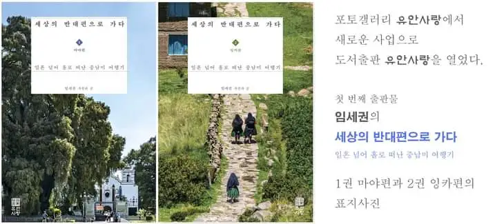 이곳에 미완의 중남미 여행 이란 제목으로 연재하던 글이 두권의 책으로 묶여져 출간 되었습니다. 이 책을 위해 유안사랑이라는 출판사도 만들었습니다. 유안사랑은 본래 내가 운영해오던 사진 갤러리인데 사업내용에 출판업을 추가한 것입니다.