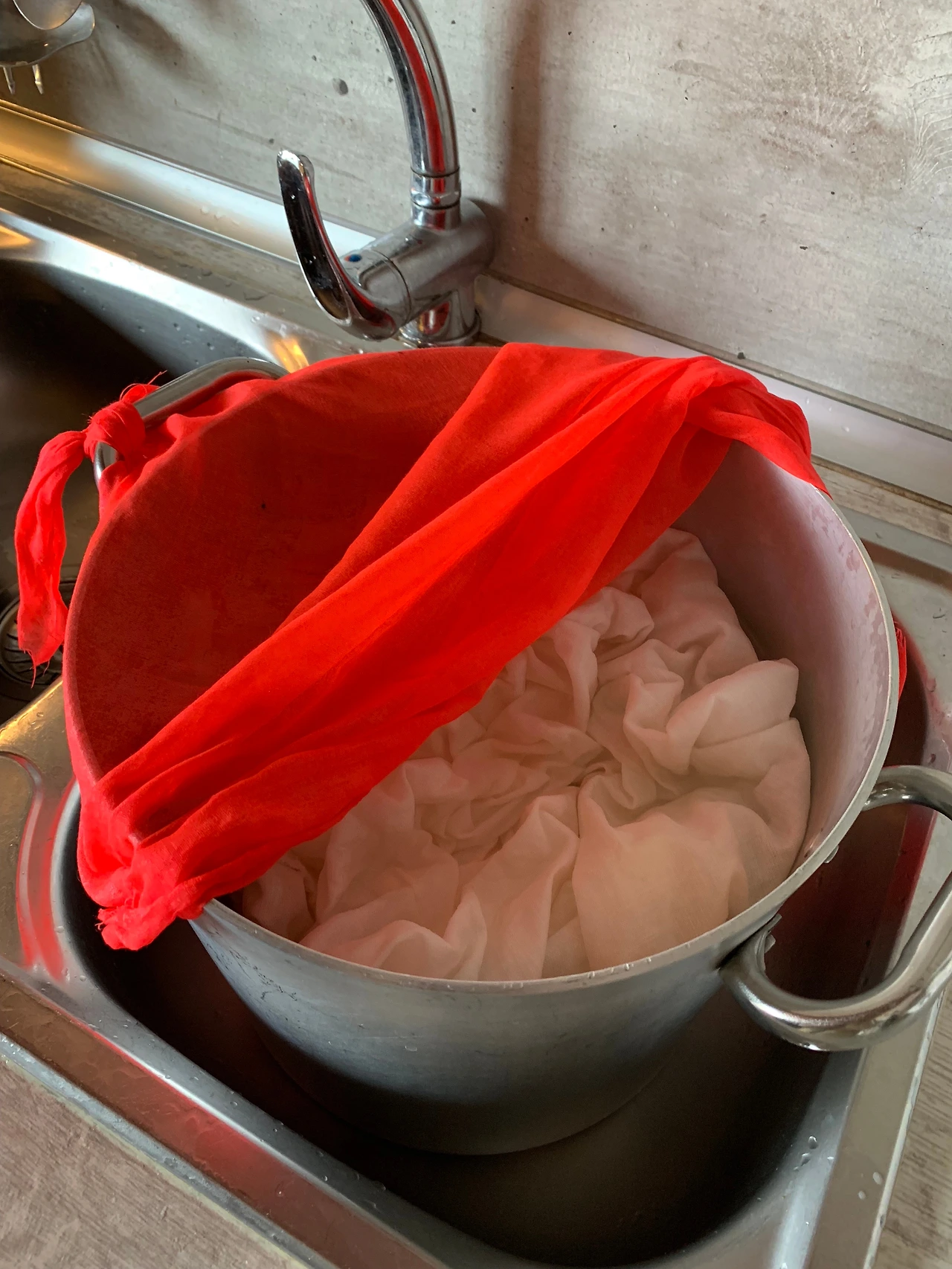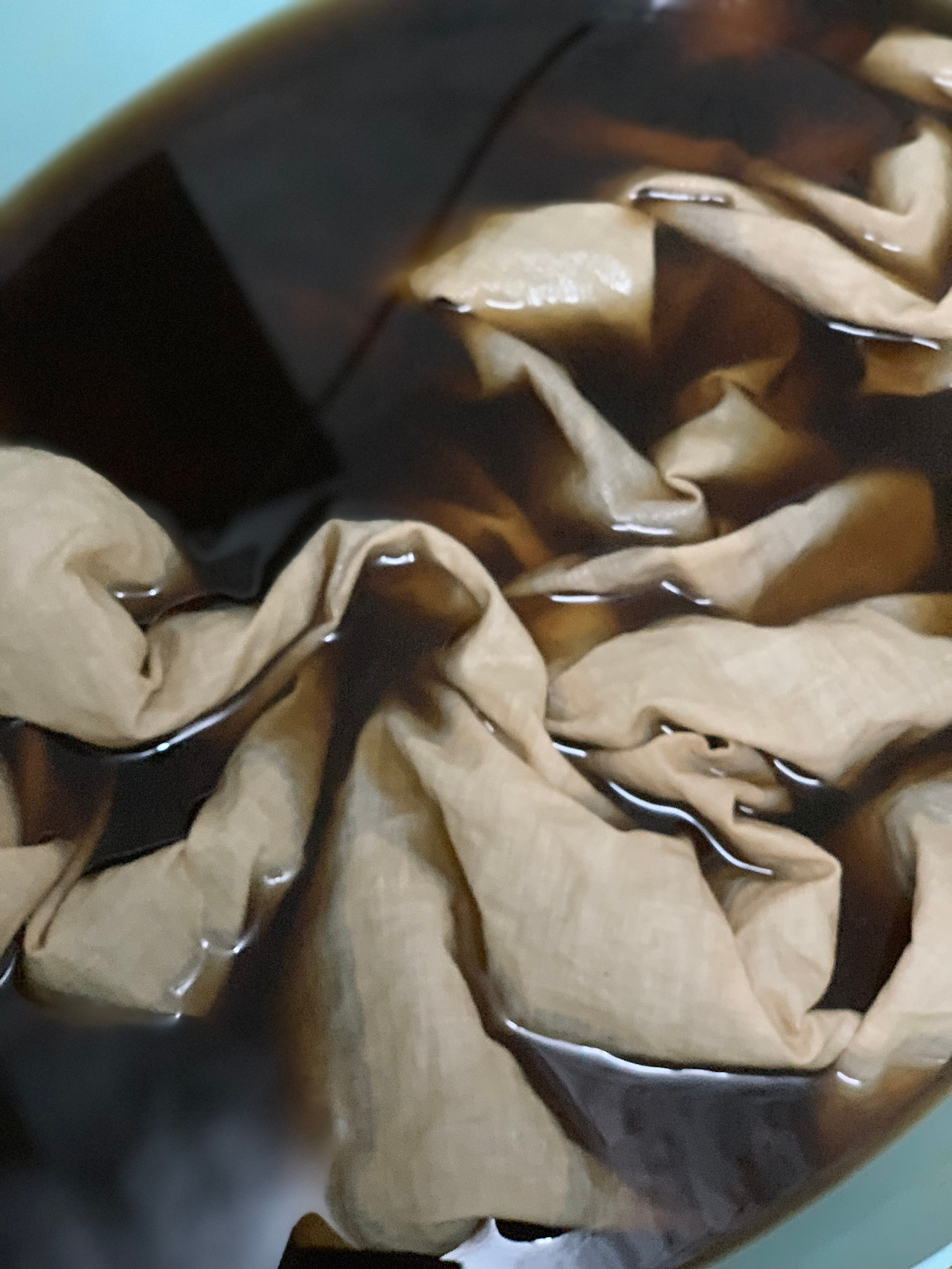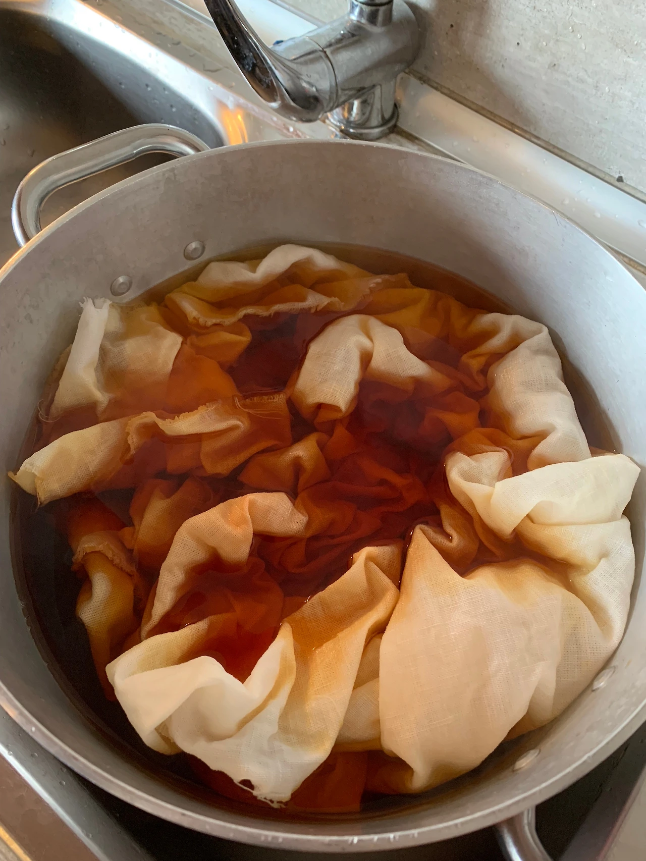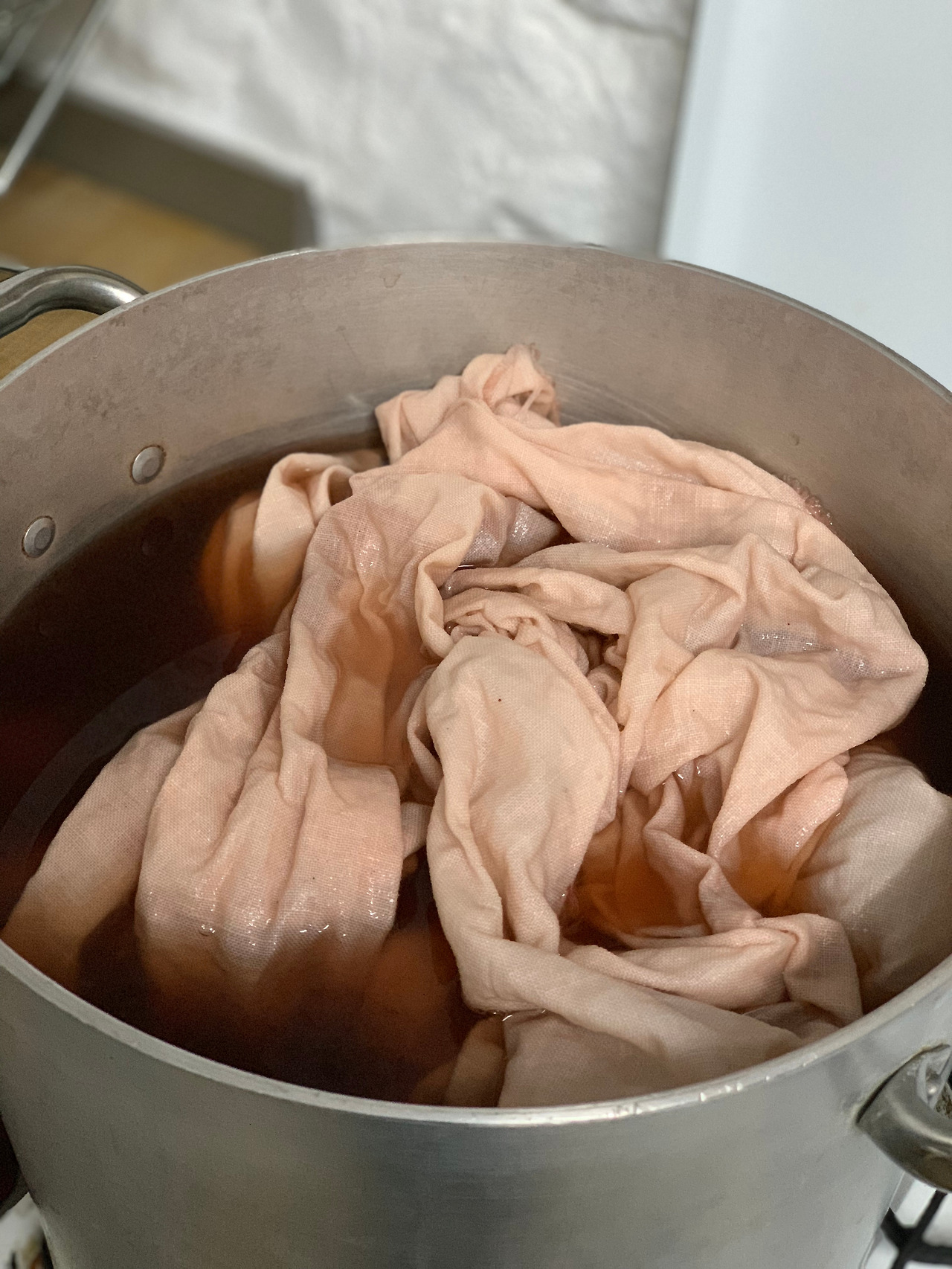 양파껍질 염색과 같은 방법으로, 꼭두서니를 끓였다가 거즈로 필터를 해서 우려낸 물만 받아 수돗물을 섞어 또 은은한 불에 끓였습니다. 그리고 색을 최대한 흡수시키기 위해서 거의 3-4일을 끓이고 뒤적이고 담가 놓는 것을 반복했는데, 물에서 살짝 오묘한 냄새가 나기 시작해서 빼냈습니다.
