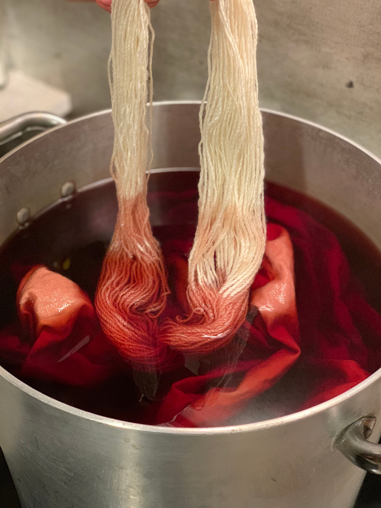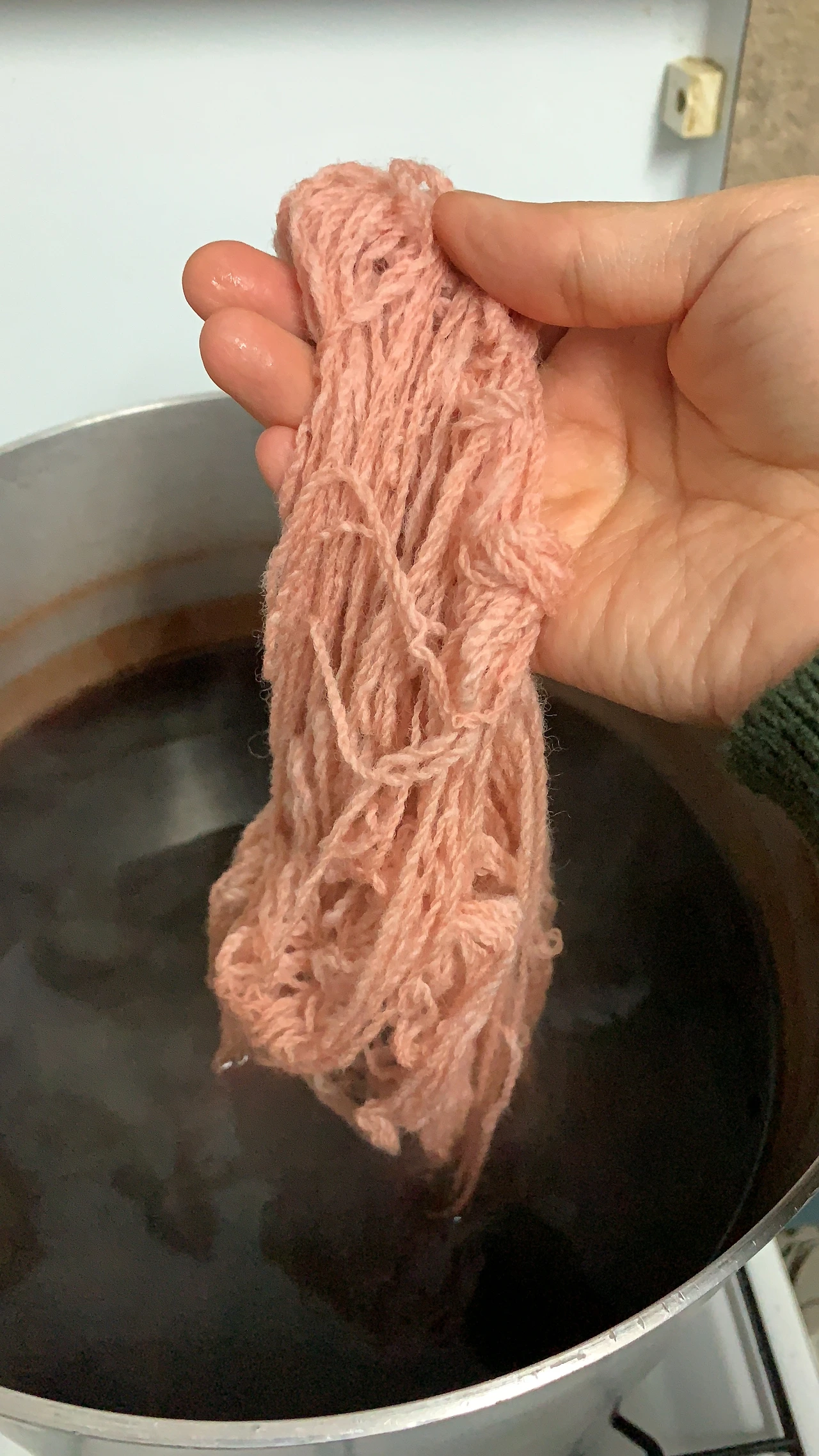 클라우디아가 핑크색 양모실을 갖고 싶다고 갓 우려낸 뜨끈뜨끈한 꼭두서니 물에 30분 담가놓았더니 예쁜 핑크색이 되었습니다. 하지만 저의 2.5 야드 린넨은 양이 많아서 연한 핑크로 나왔습니다. 식물성과 동물성 텍스타일의 염색 흡수력과 다른 점을 이렇게 발견했습니다. 동물성 직물을 사용하게 된다면 (울이나 실크) 점착제를 사용하지 않고 직물을 끓인 물에 적셨다가 바로 염색물에 넣어 담가 놓아도 됩니다.
