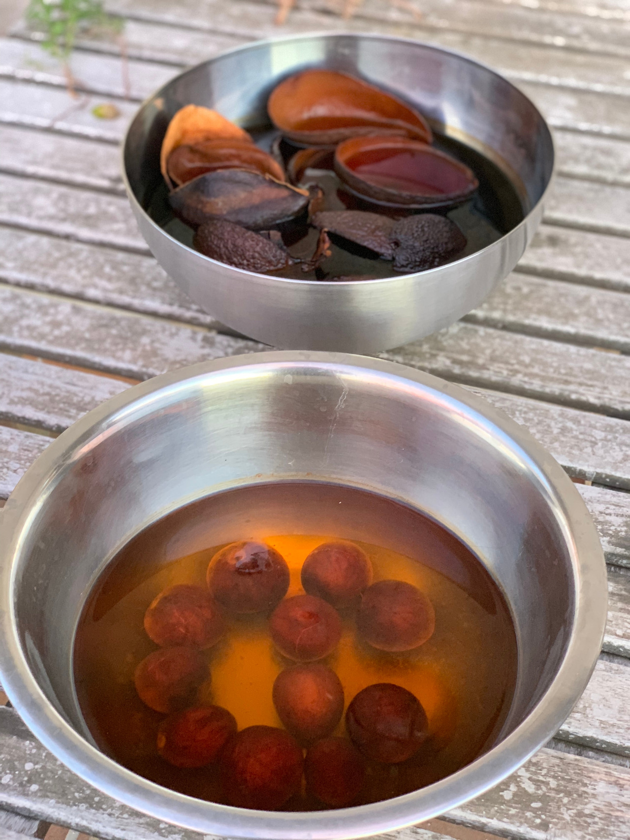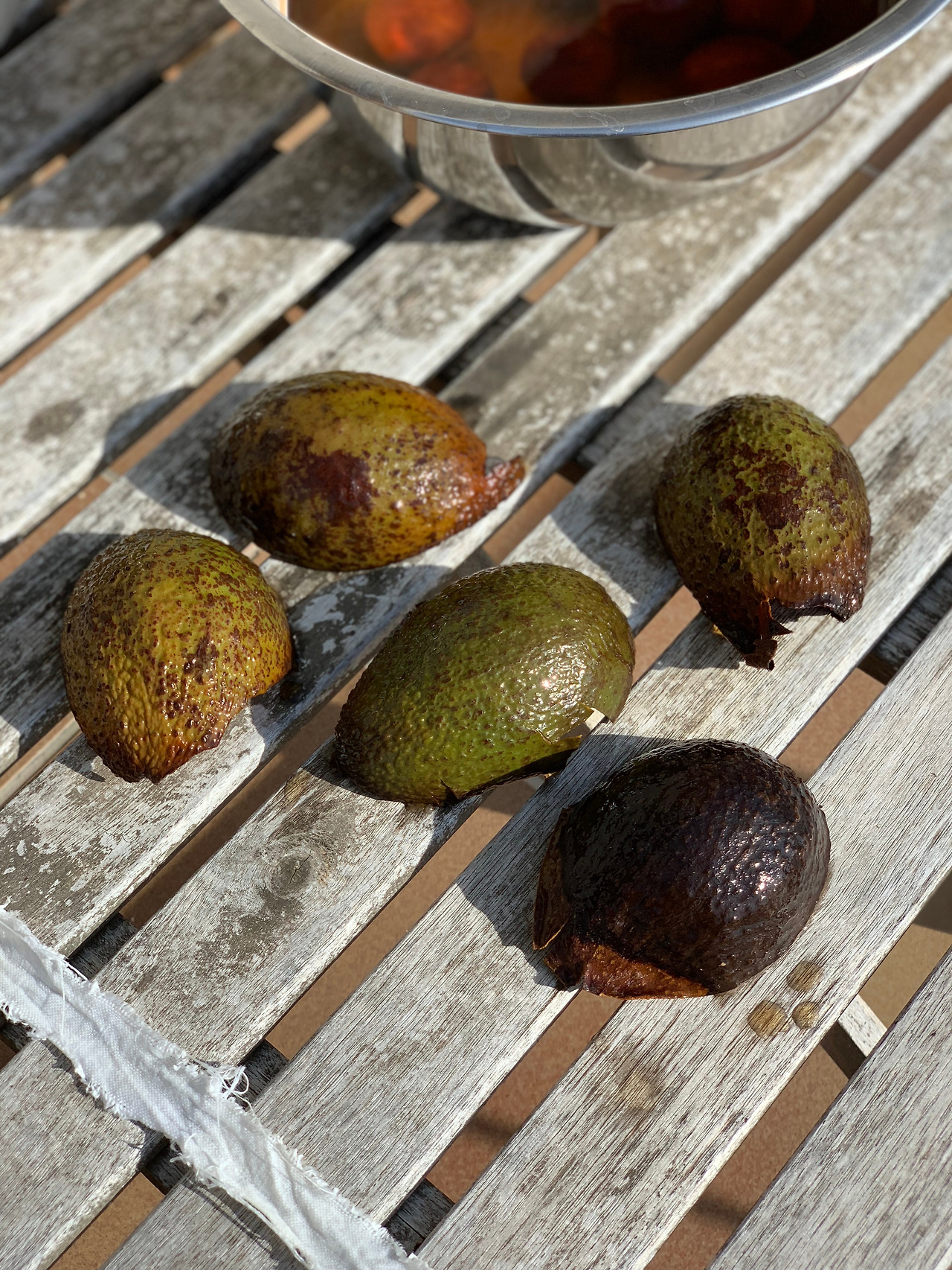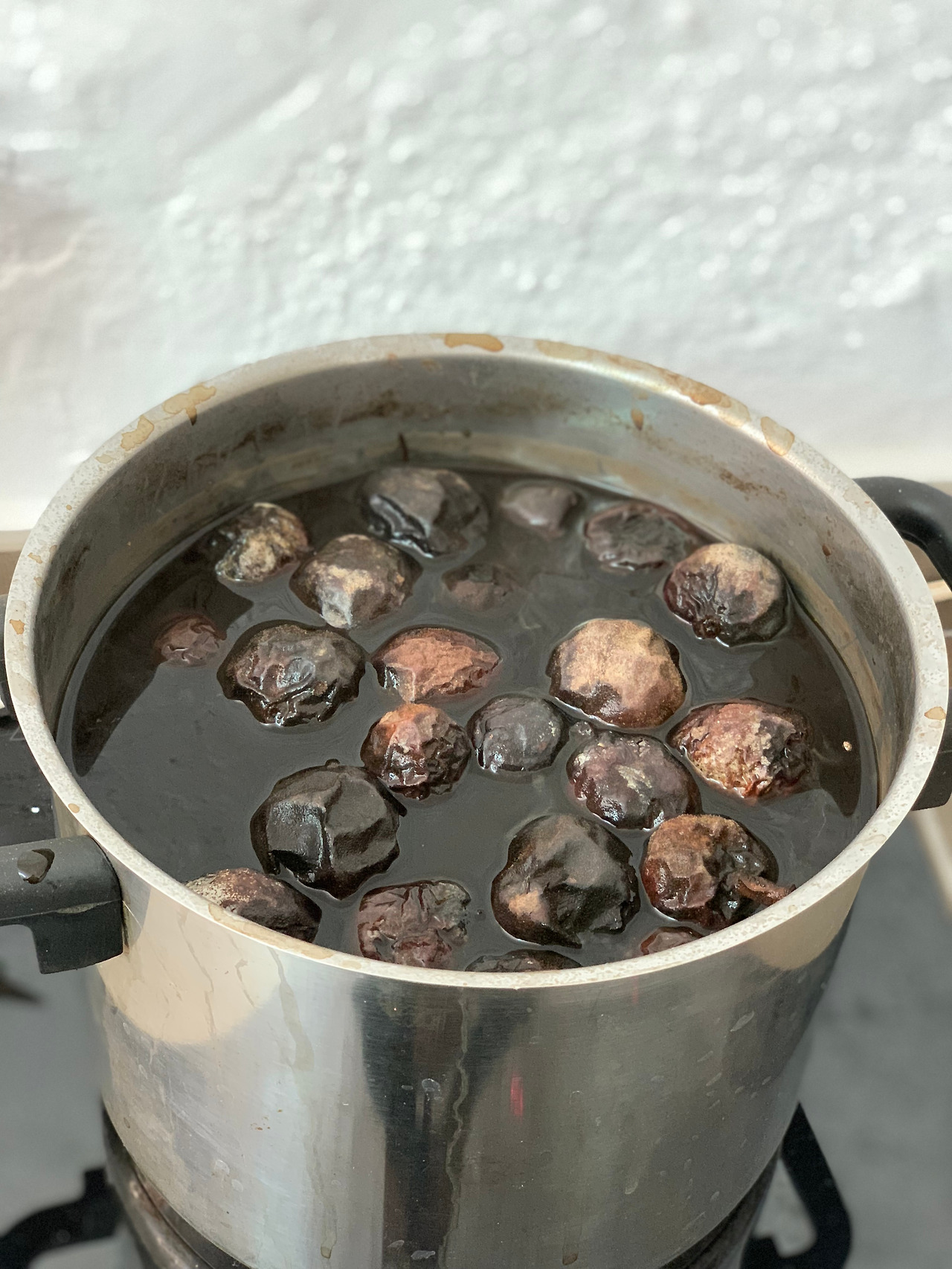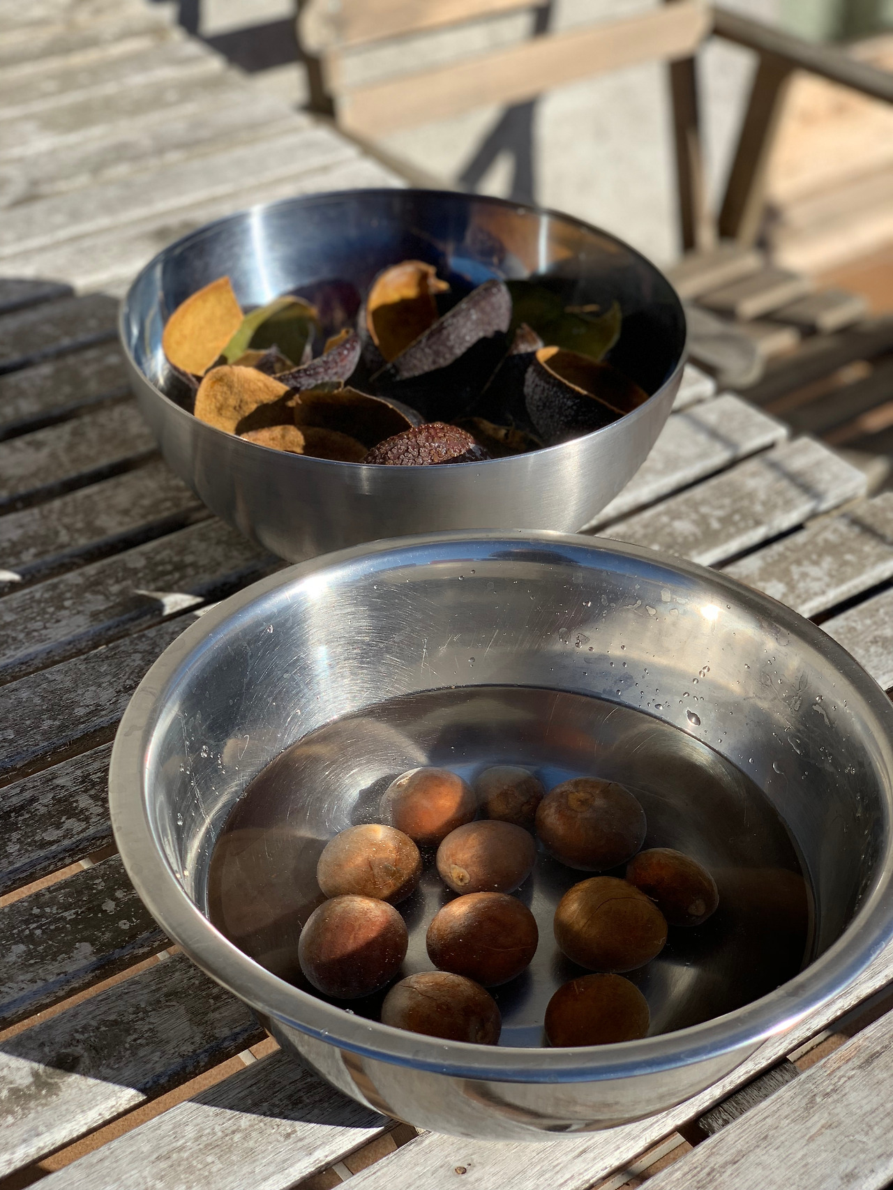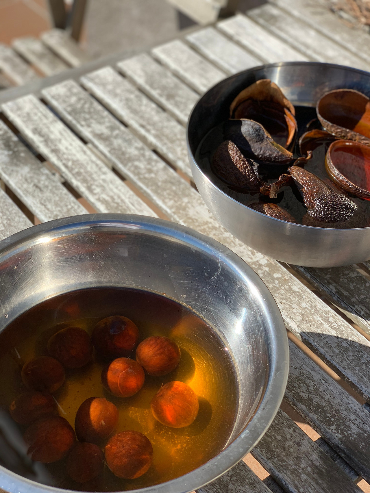 호두를 달인 물이 상당히 진했고 냄비가 하나밖에 없는 이유로 호두는 아보카도와 같이 물에 담그는 방법으로 염색을 선택했습니다.