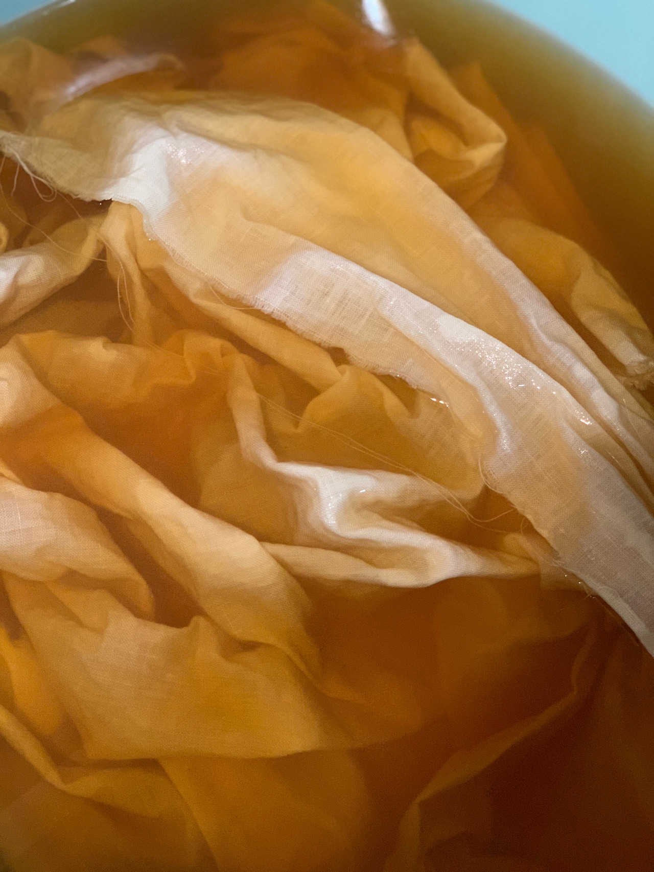 너무 큰 직물을 준비하는 바람에 첫 아보카도 염색은 며칠 동안 물에 담가 놓는 방법으로 시작했습니다.
