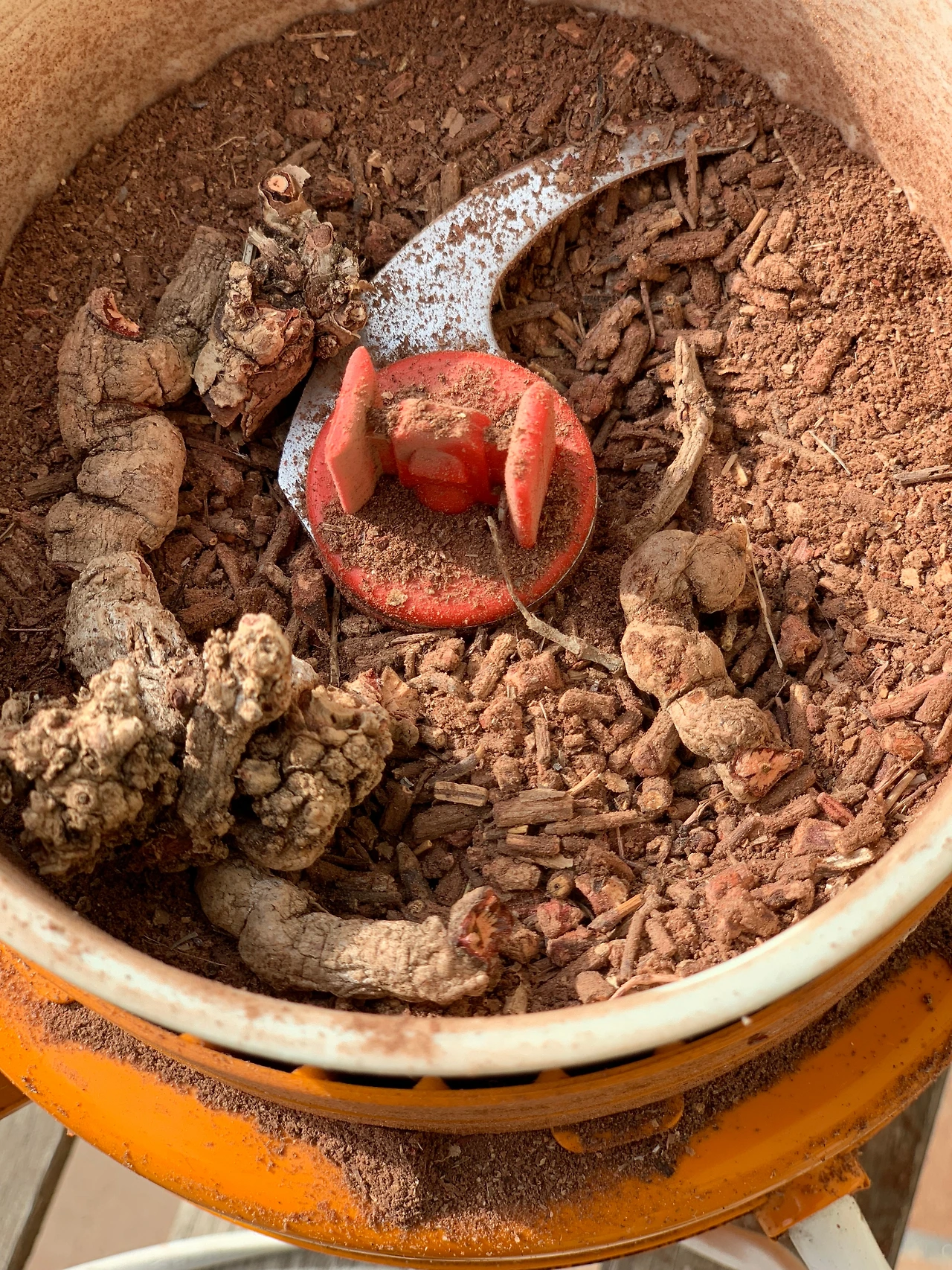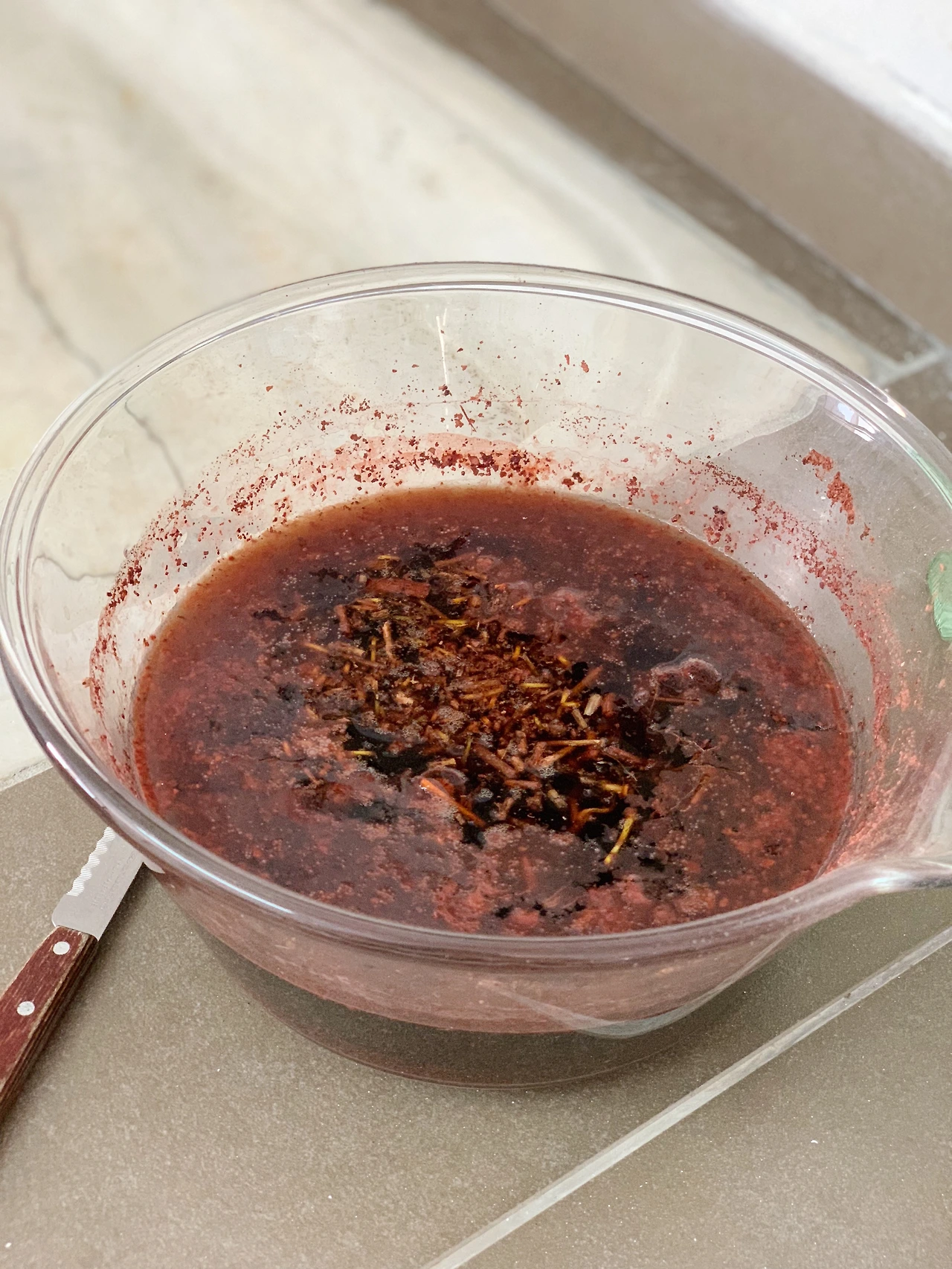 그리 아름답지 못한 모습으로 꼭두서니를 채취하고 집에 갖고 와서 깨끗하게 씻어 가위로 자른 뒤 전에 우리고 있던 꼭두서니 뿌리 물에 혼합시켜 넣었습니다.